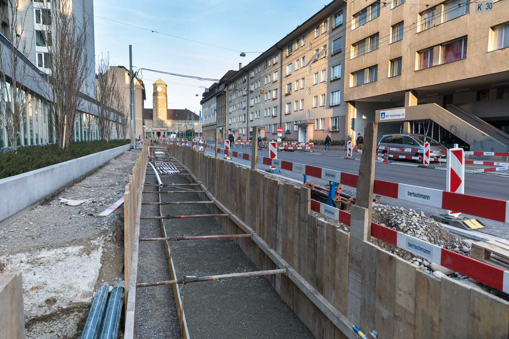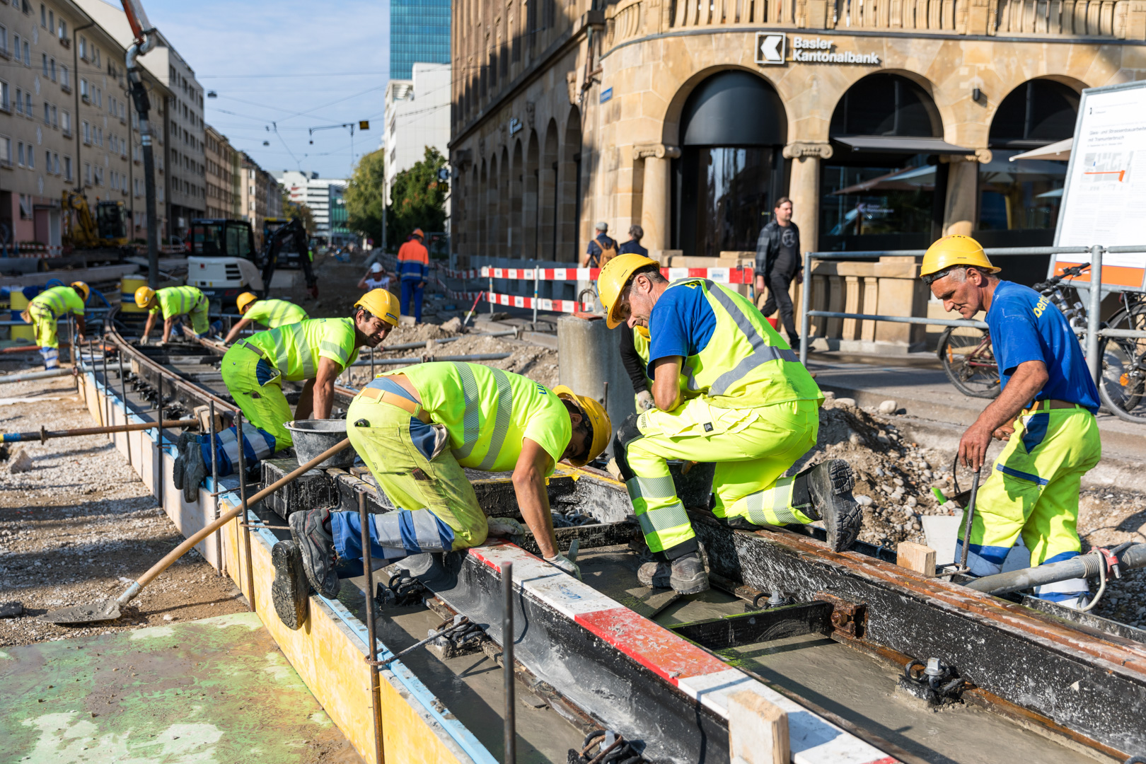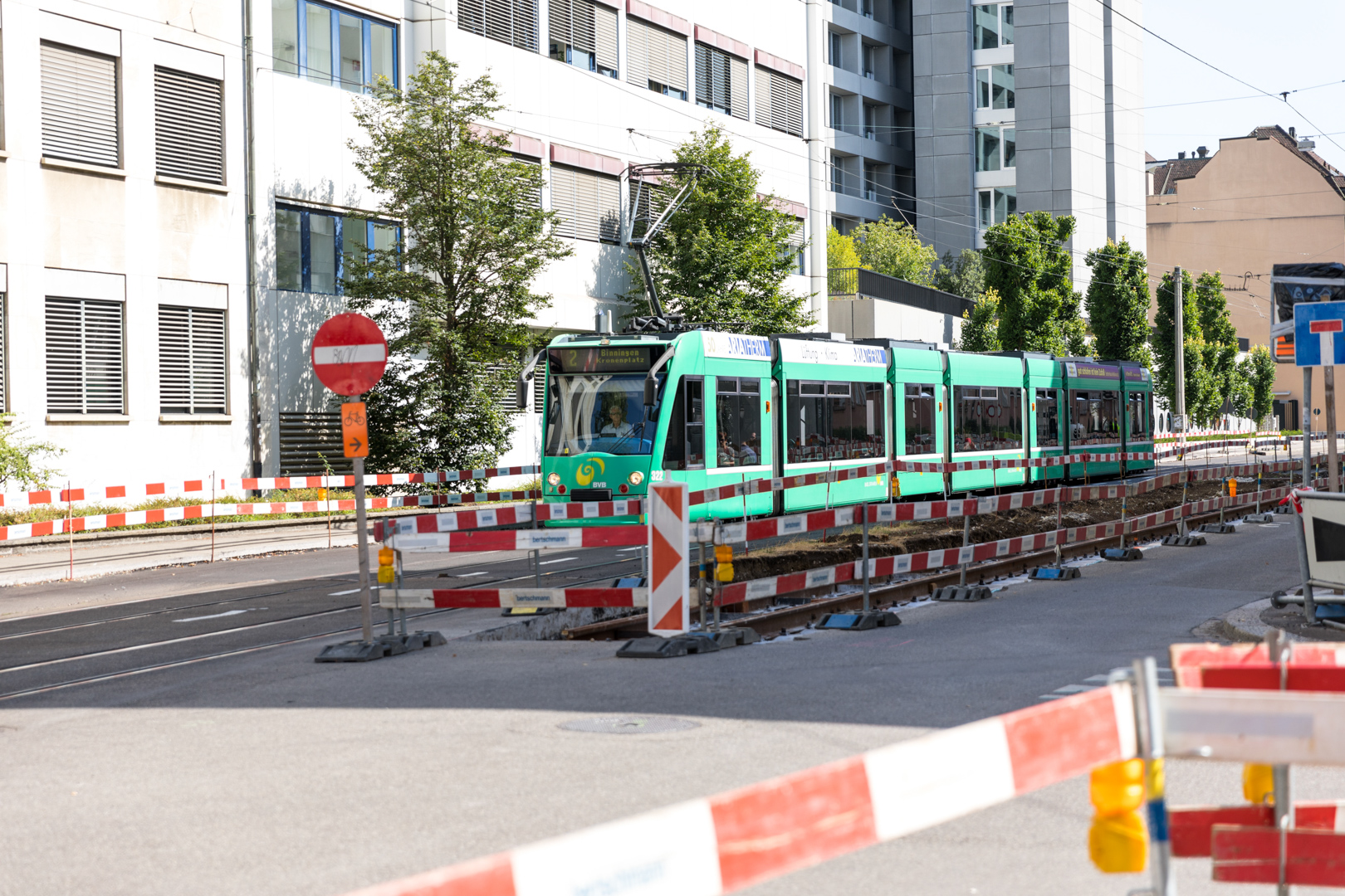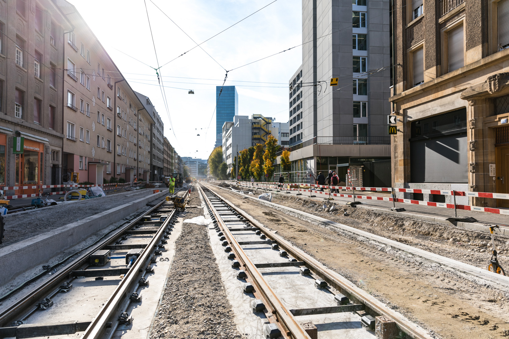 Da entlang der Rosentalstrasse die Tramgleise nicht nur erneuert, sondern von der einen Strassenseite auf die andere verschoben werden, legt das Team direkt mit den neuen Gleisen auf der rechten Strassenseite los. Ein Teilabschnitt von ca. 100 m bei der Tramhaltestelle «Badischer Bahnhof» steht bereits nach kurzer Zeit. Die Anwohner der Rosentalstrasse erhalten neue Hausanschlüsse für Wasser, Gas und Strom. Zudem brechen wir die Randabschlüsse ab, um in der nächsten Etappe die Gleise auf der linken Strassenseite zu ersetzen.