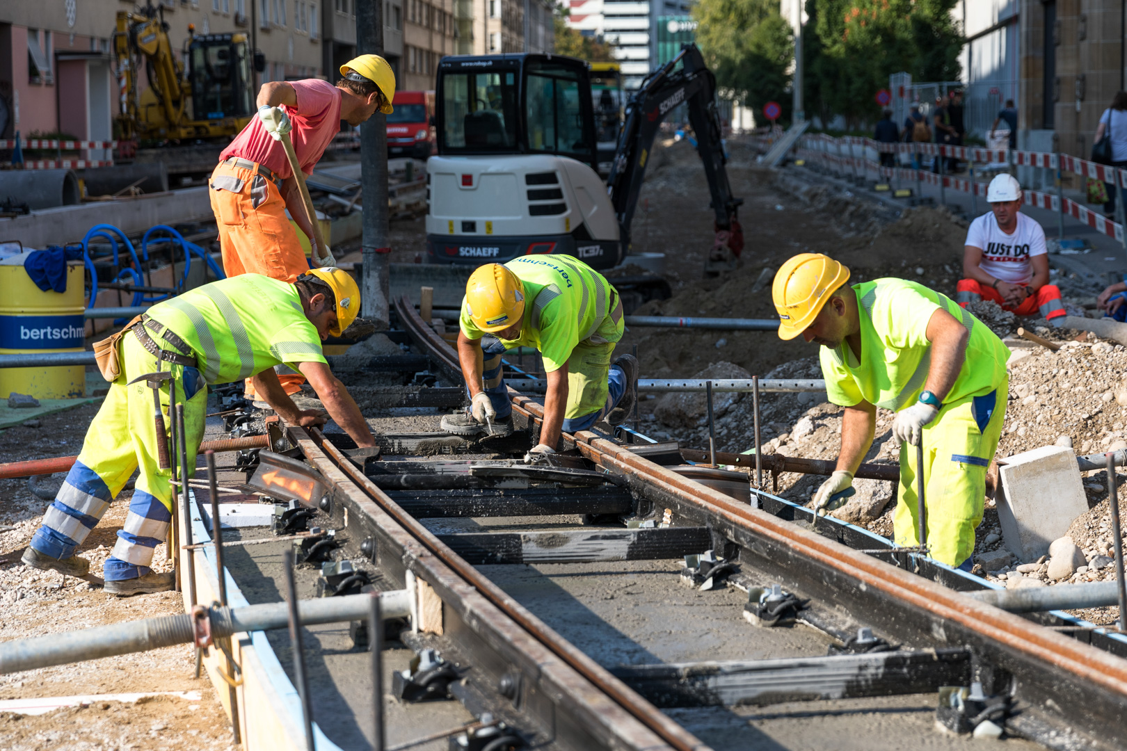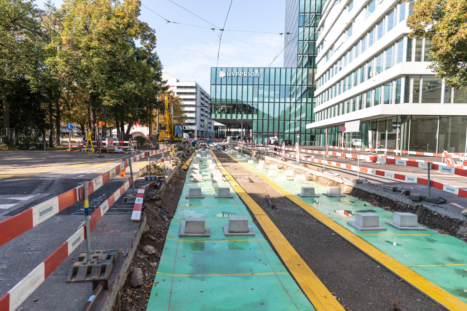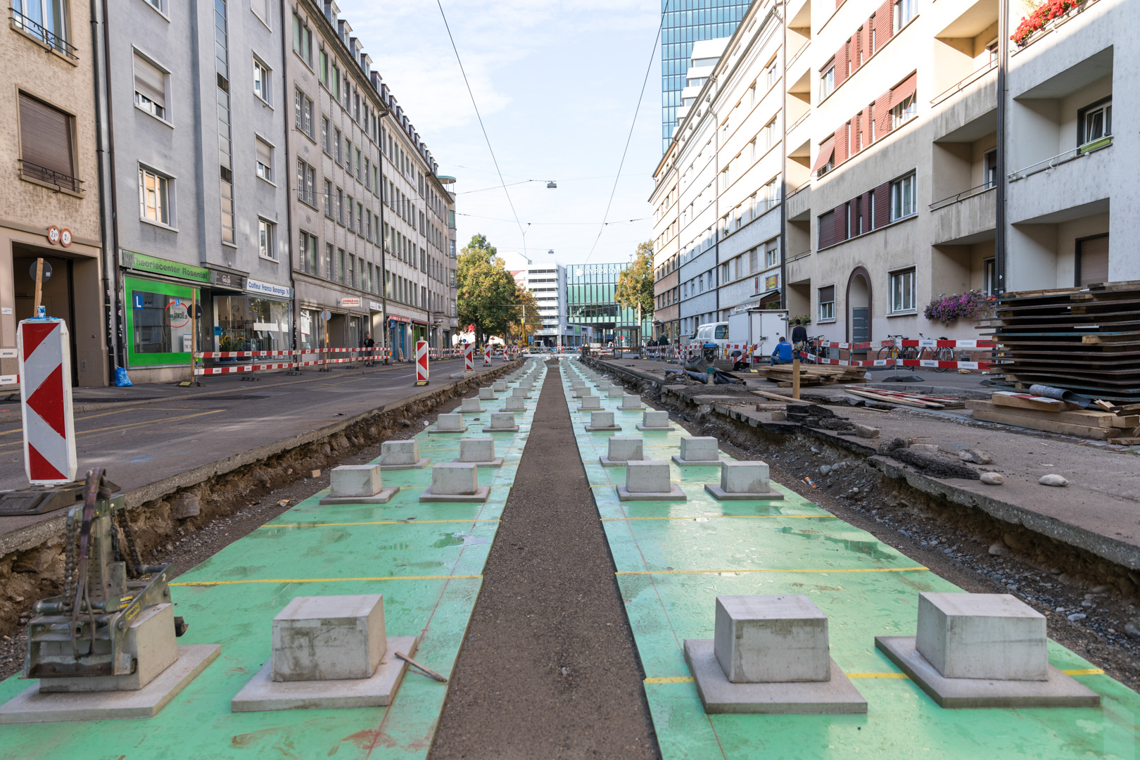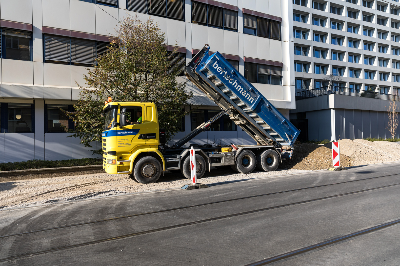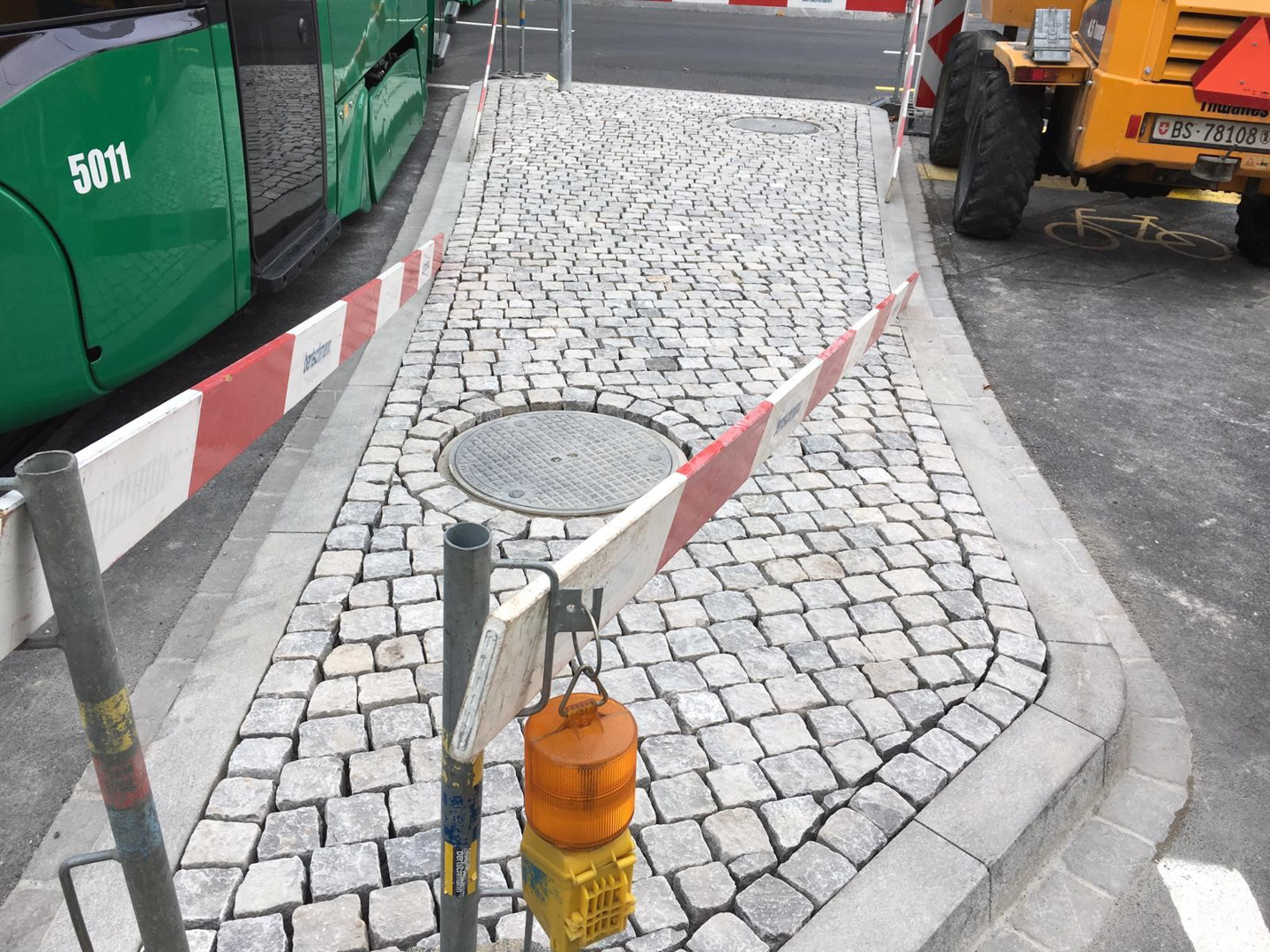 Da entlang der Rosentalstrasse die Tramgleise nicht nur erneuert, sondern von der einen Strassenseite auf die andere verschoben werden, legt das Team direkt mit den neuen Gleisen auf der rechten Strassenseite los. Ein Teilabschnitt von ca. 100 m bei der Tramhaltestelle «Badischer Bahnhof» steht bereits nach kurzer Zeit. Die Anwohner der Rosentalstrasse erhalten neue Hausanschlüsse für Wasser, Gas und Strom. Zudem brechen wir die Randabschlüsse ab, um in der nächsten Etappe die Gleise auf der linken Strassenseite zu ersetzen.