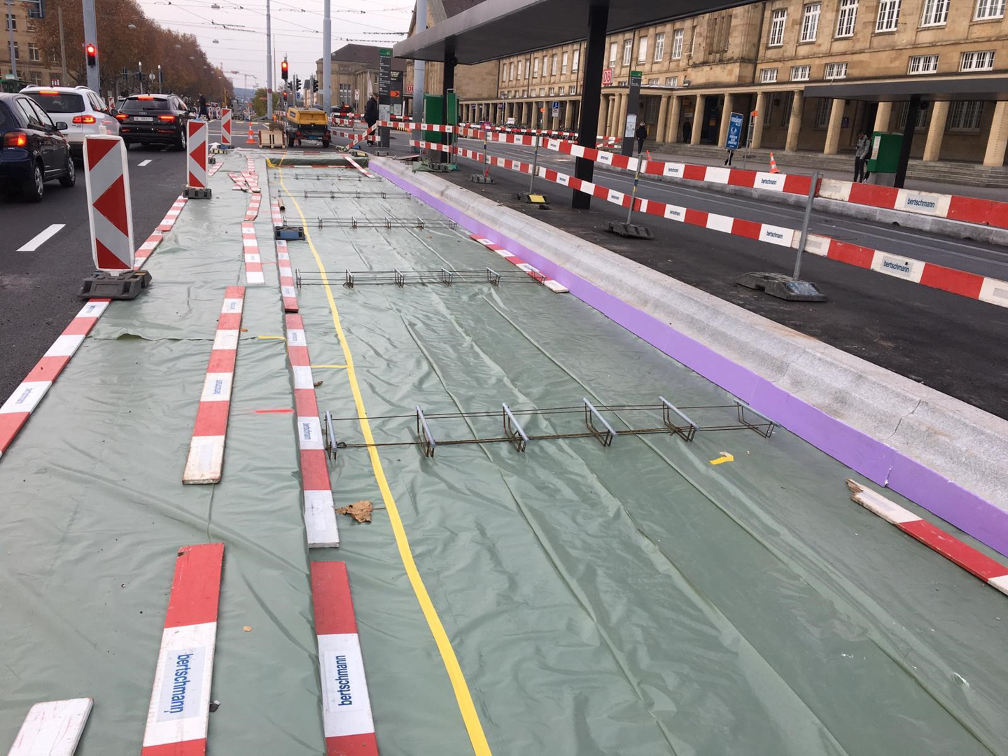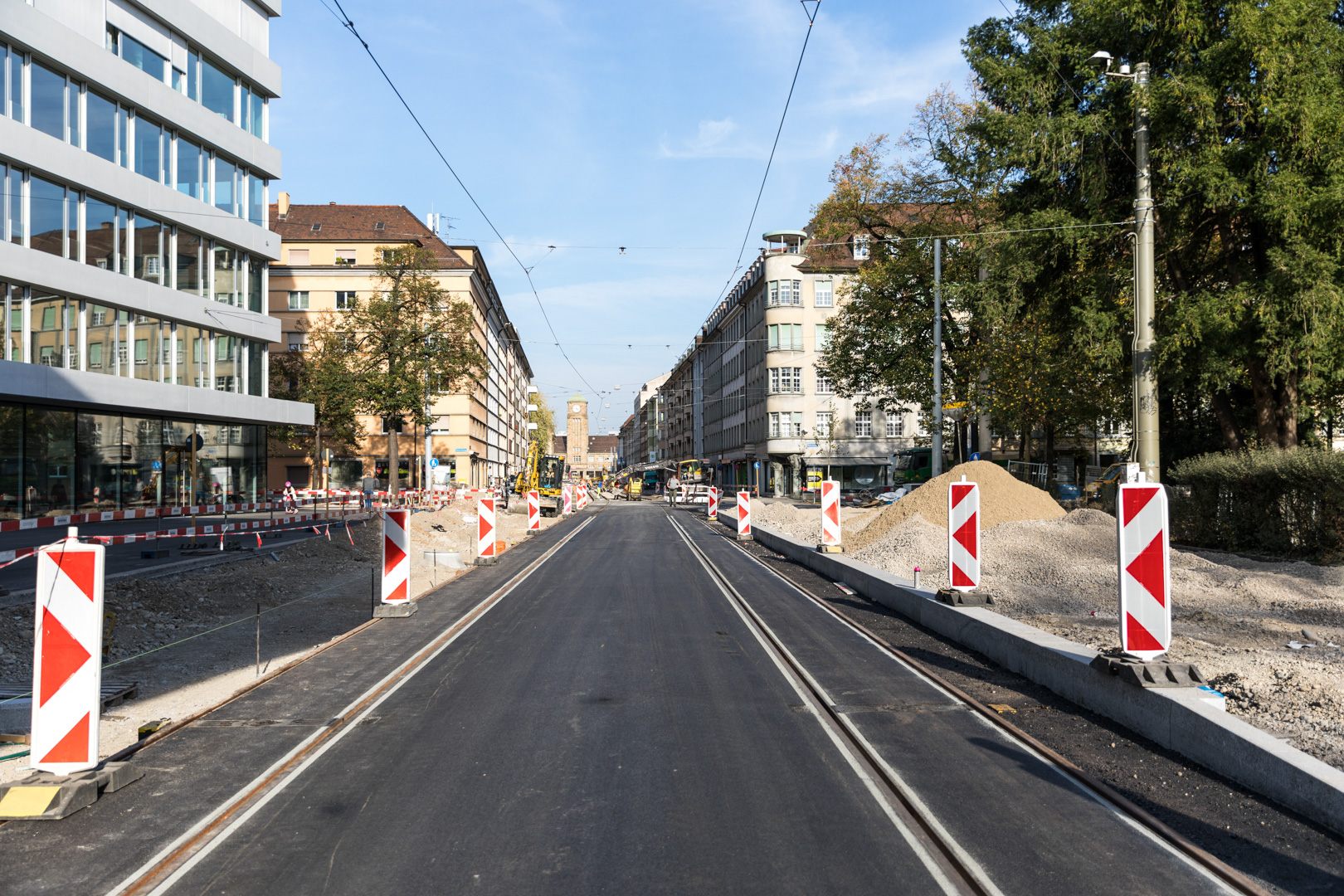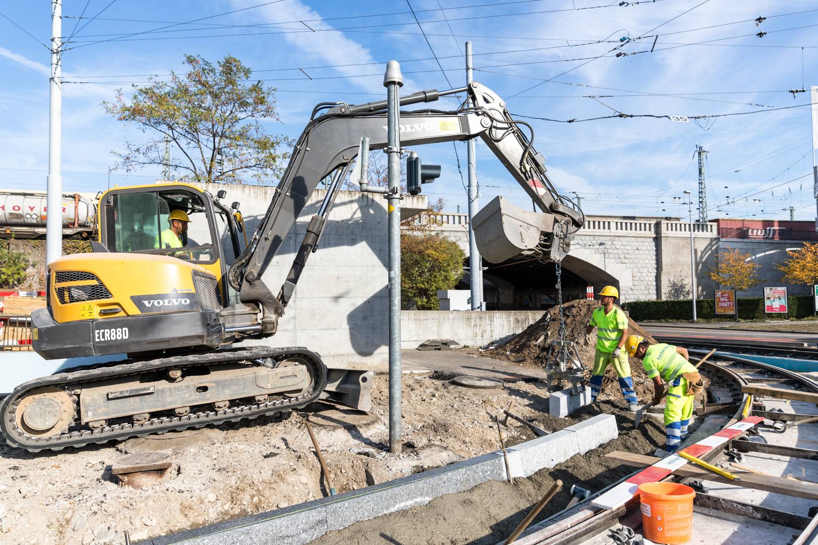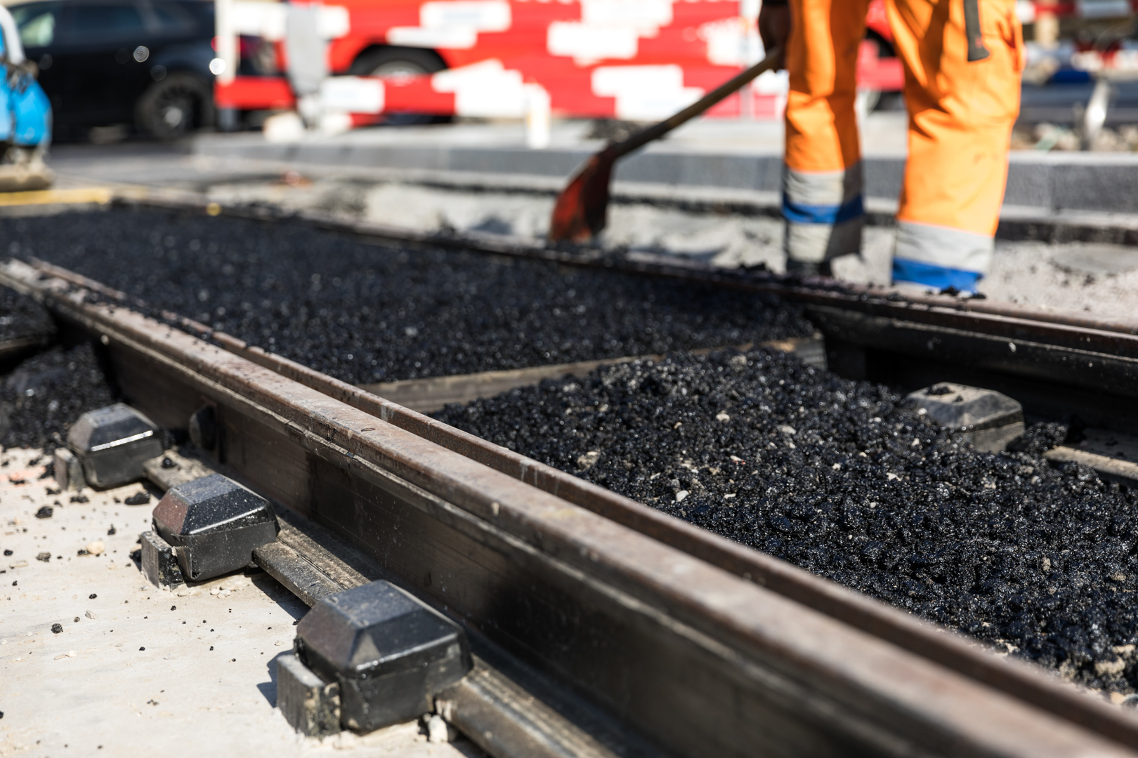 Da entlang der Rosentalstrasse die Tramgleise nicht nur erneuert, sondern von der einen Strassenseite auf die andere verschoben werden, legt das Team direkt mit den neuen Gleisen auf der rechten Strassenseite los. Ein Teilabschnitt von ca. 100 m bei der Tramhaltestelle «Badischer Bahnhof» steht bereits nach kurzer Zeit. Die Anwohner der Rosentalstrasse erhalten neue Hausanschlüsse für Wasser, Gas und Strom. Zudem brechen wir die Randabschlüsse ab, um in der nächsten Etappe die Gleise auf der linken Strassenseite zu ersetzen.