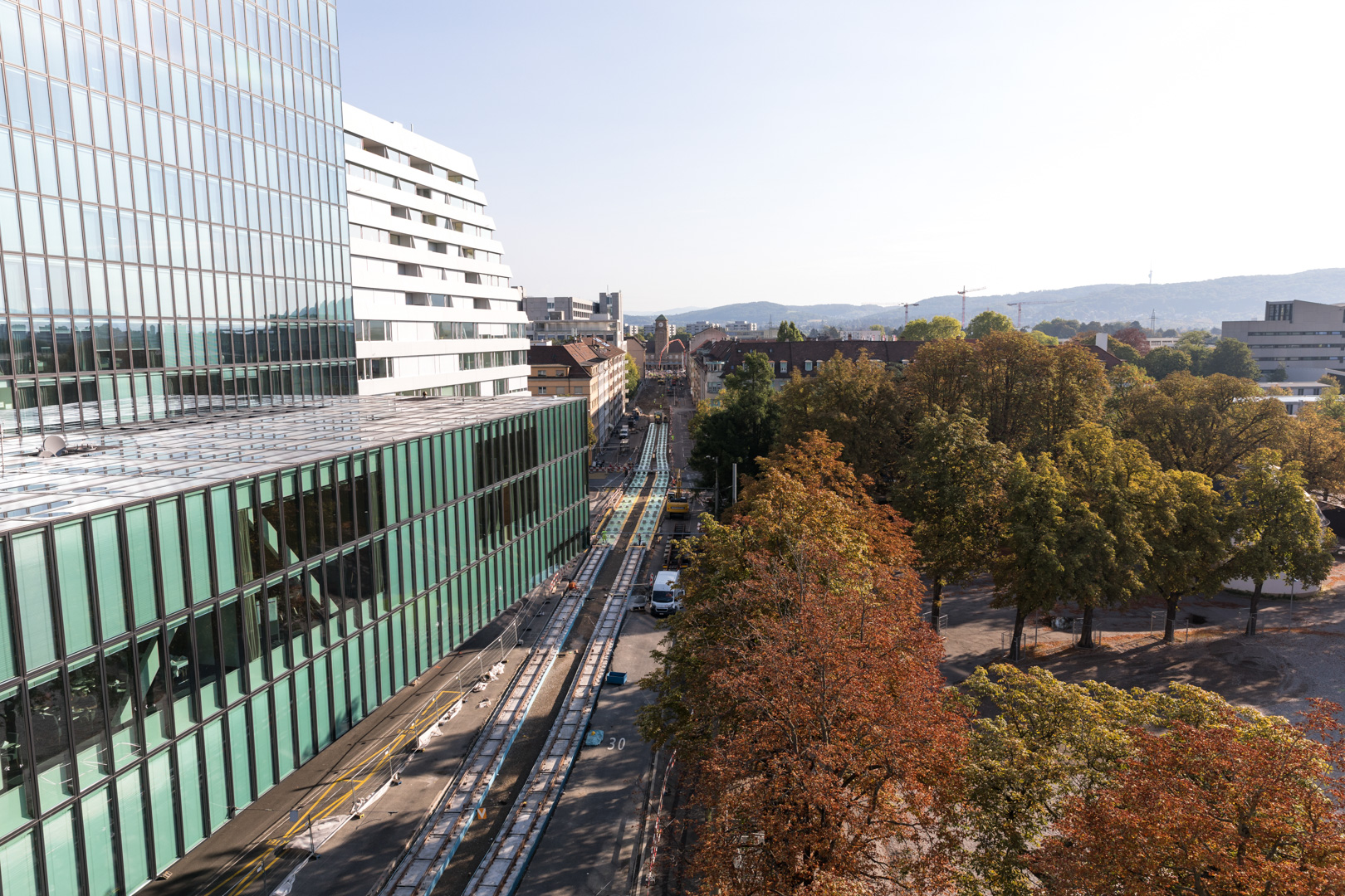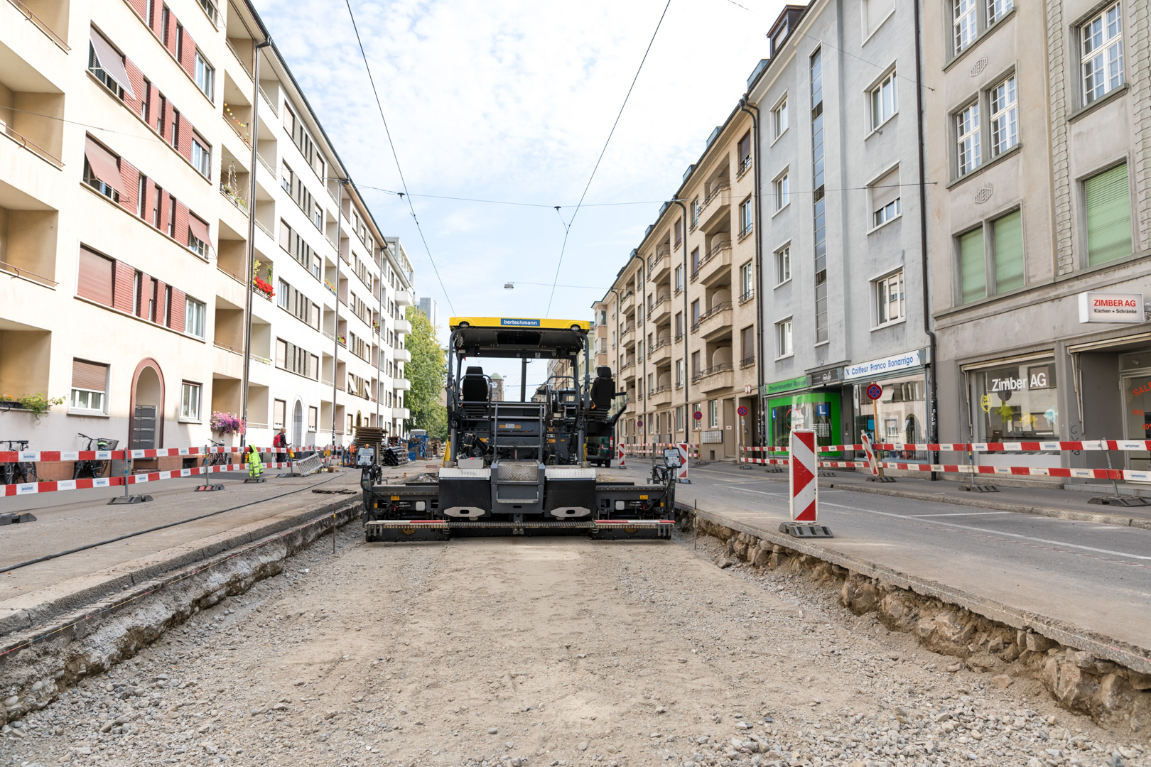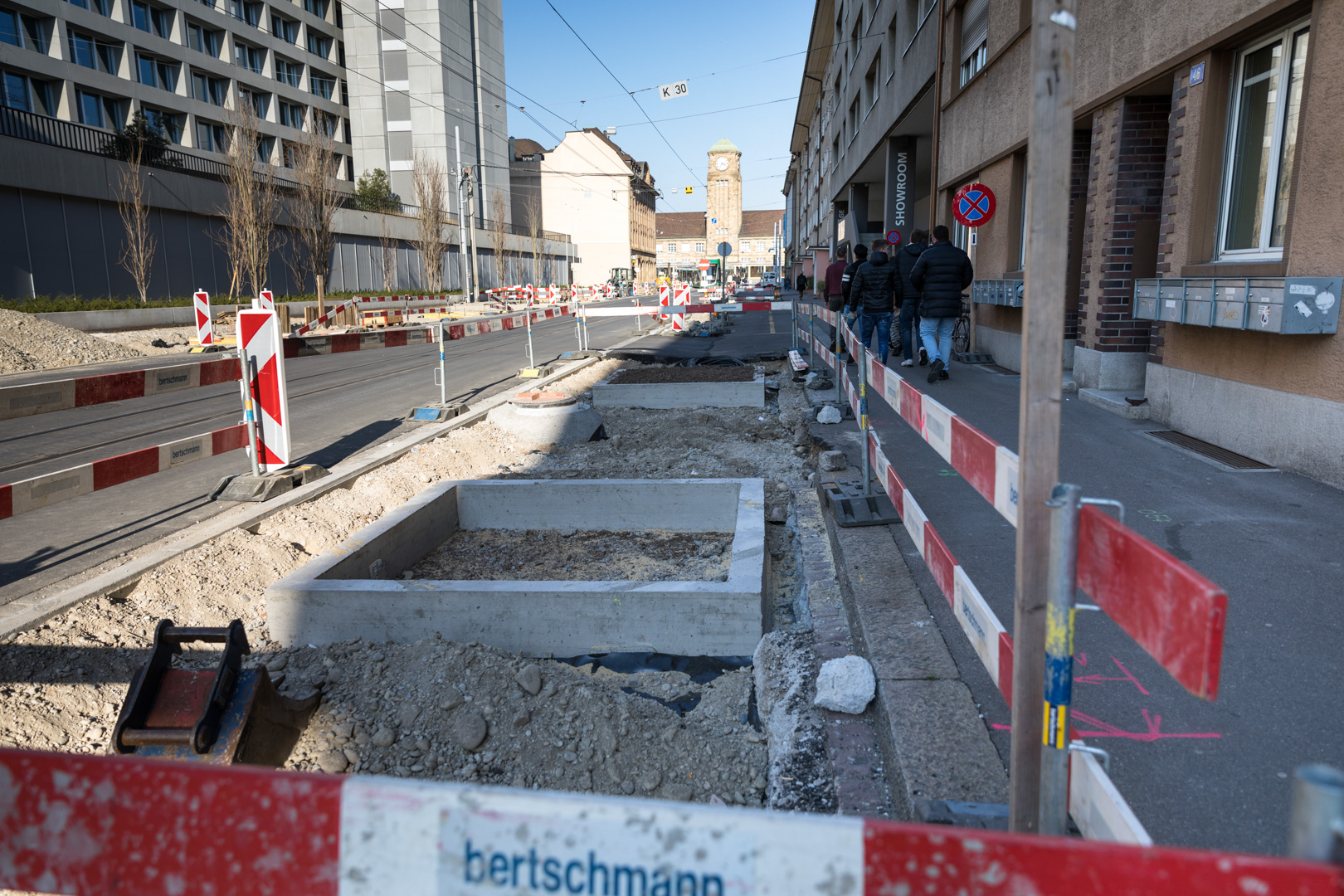 Inzwischen kehrt wieder etwas Ruhe ein und die nächste Etappe startet mit den Werkleitungsgräben entlang der Rosentalstrasse. Die 10 Fachkräfte, nun wieder im «normalen», einschichtigen Betrieb, verlegen die Leitungen und schliessen die Gräben. Auch die verbreiterten Trottoirs beidseitig der Rosentalstrasse stellen sie instand.