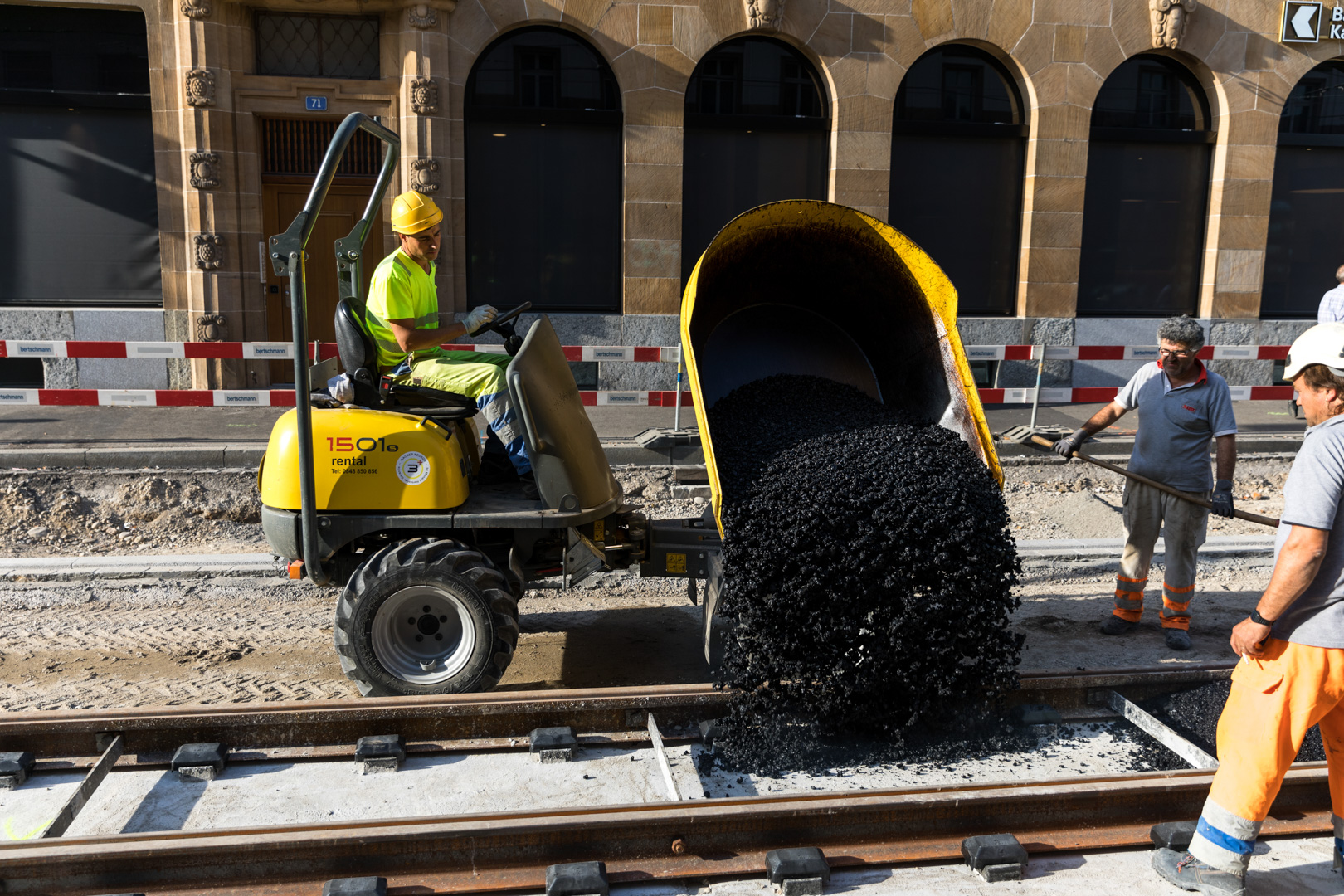 Ab jetzt sind beinahe rund um die Uhr Leute im Einsatz. Unser 30-Mann-Team arbeitet im Eiltempo, um in den vorgegebenen sechs Wochen der Tramsperre die Arbeiten auszuführen. Nicht nur für die Arbeiter ist diese Zeit sehr intensiv, auch die Verkehrsteilnehmer und ÖV-Nutzer sind einer Herausforderung gestellt. Die Verkehrsführung wechselt nun mehrmals entlang der Schwarzwaldallee. Dank der guten Verkehrsleitung durch die Helfer des Verkehrsdienstes, verlaufen die Umstellungen reibungslos. Wir entfernen die Gleise entlang der Rosentalstrasse und der Schwarzwaldallee mit dem Riesenbeisser (siehe Bild Nr. 2). Anschliessend brechen wir den Gleisbeton ab und die Vorbereitungsarbeiten für die neuen Gleise beginnen. Fortan läuft alles zack-zack: Boden verdichten, Gleismatten verlegen, Anlieferung und Einbau der neuen Gleise während Nachteinsätzen sowie das Einbetonieren der Gleise. Nach dem Einbau der Randabschlüsse widmen wir uns dem Belagseinbau im Gleis- und Haltestellenbereich. Bei der Schwarzwaldallee bauen wir den Deckbelag ein.