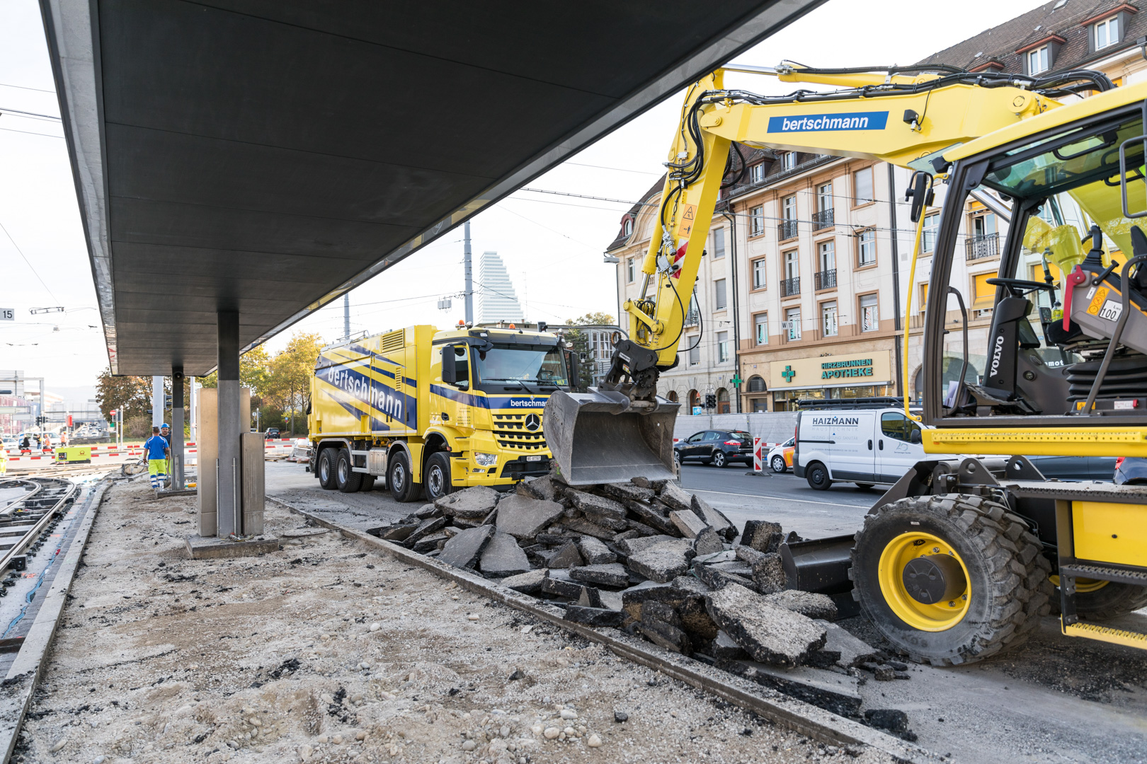 Am 2. Juli 2018 startet die erste der insgesamt vier Bauetappen. In dieser rund zwei Monate andauernden Phase gilt das Hauptmerk den Vorbereitungs- und Werkleitungsarbeiten. Die 10 Mann starke Truppe beginnt mit dem Rückbau der bestehenden Bushaltestelle «Badischer Bahnhof».