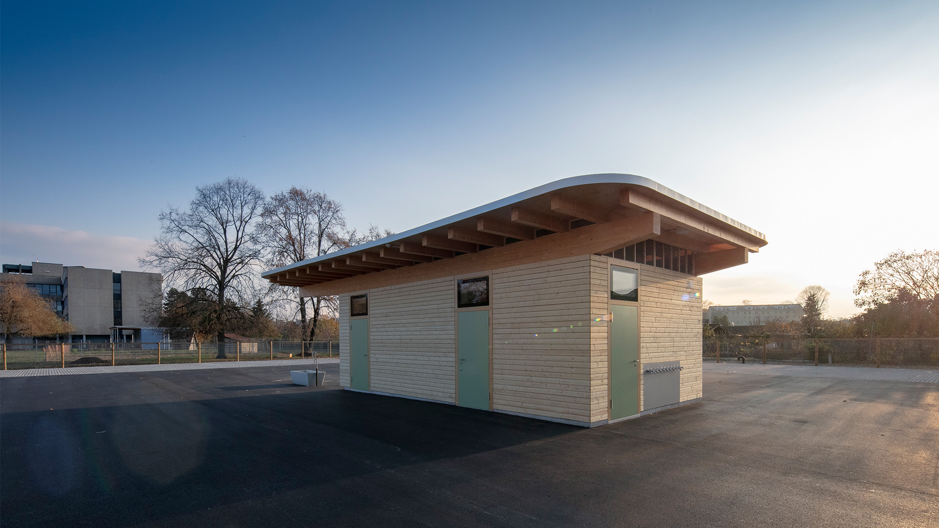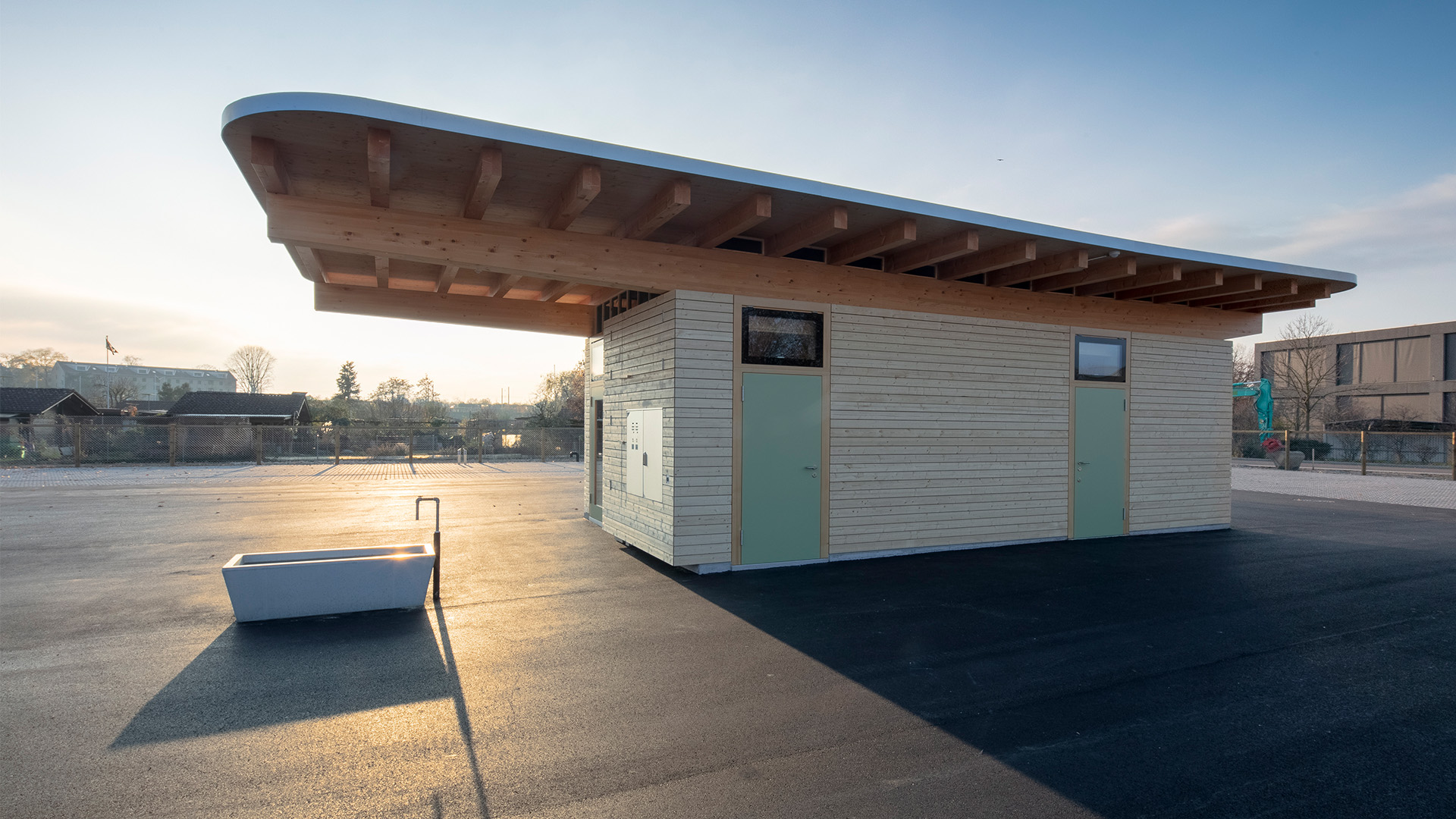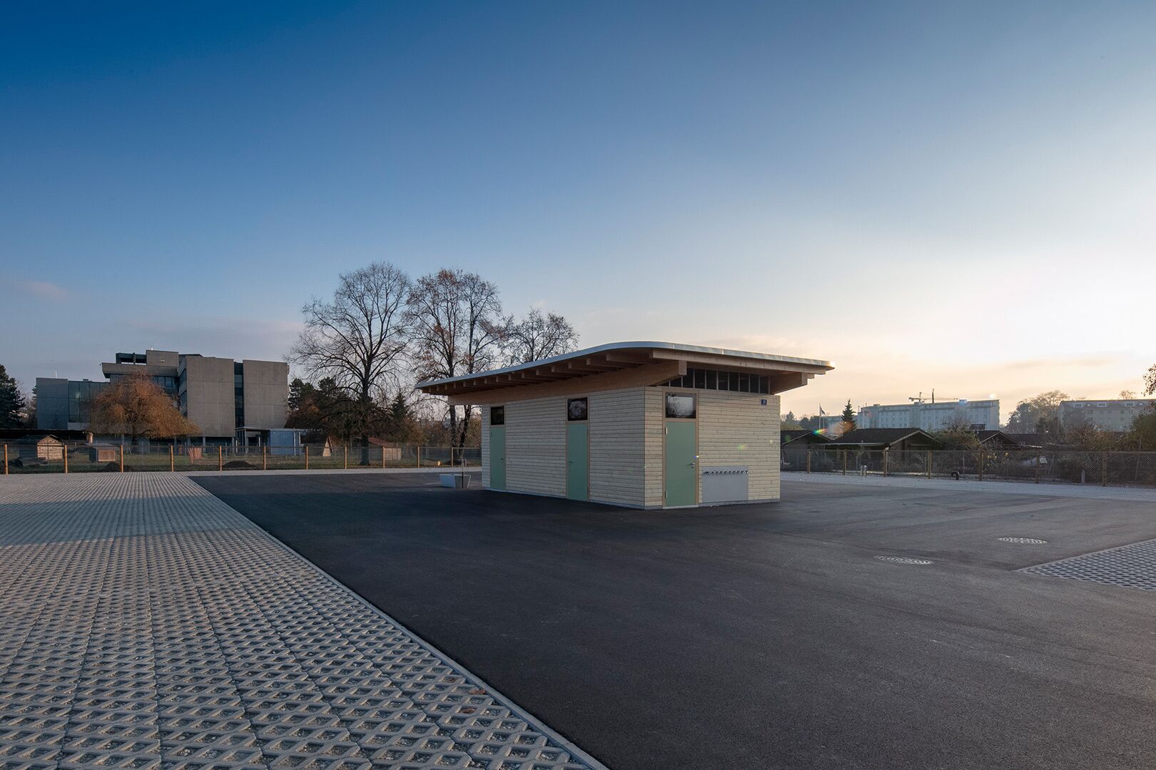 Bertschmann erhielt den Auftrag, den 2000 m2 grossen Platz mit seinem Infrastrukturgebäude zu bauen. Vom zentralen Gebäude legten wir die Elektro- und Frischwasserabnahmestellen und eine zentrale Abwasser-Entleerungsstelle für die Schmutzwassertanks der Wohnwagen. Das Fundament und die Bodenplatte gehörten ebenfalls zum Auftrag. Der Holzaufbau folgte später durch ein anderes Unternehmen.