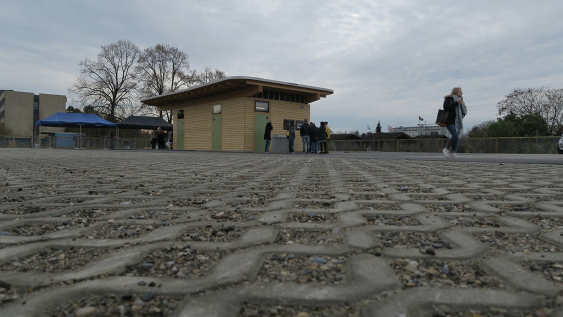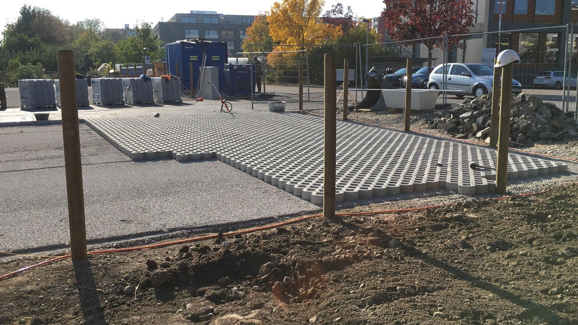 Vom Infrastrukturgebäude aus legten wir die Stromanschlüsse zu jedem einzelnen Stellplatz. Anschliessend wurde der Belag eingebaut und die Stellplätze erhielten Rasengittersteine.