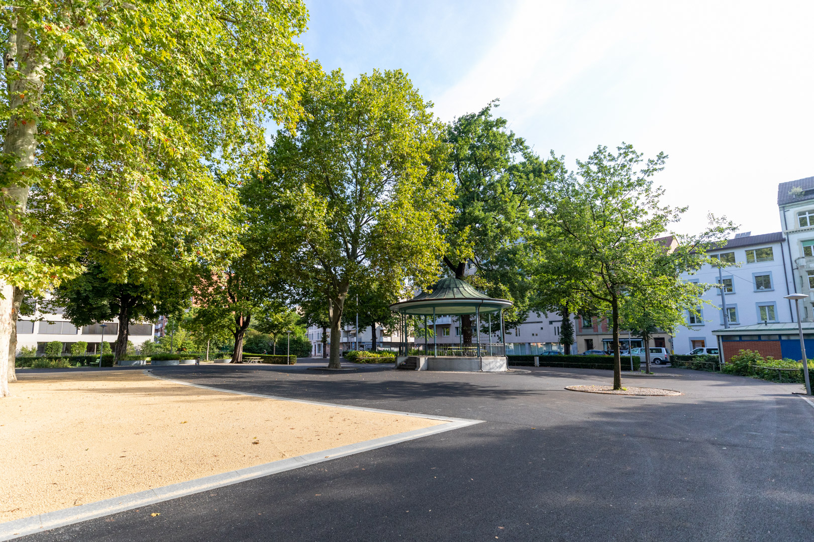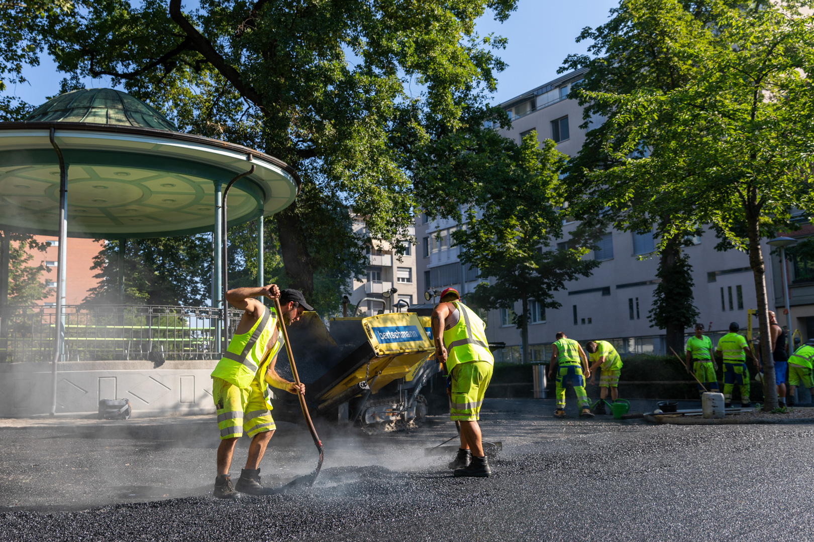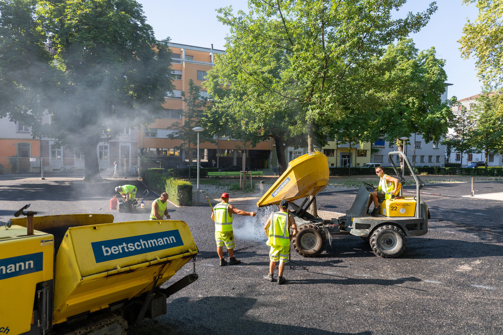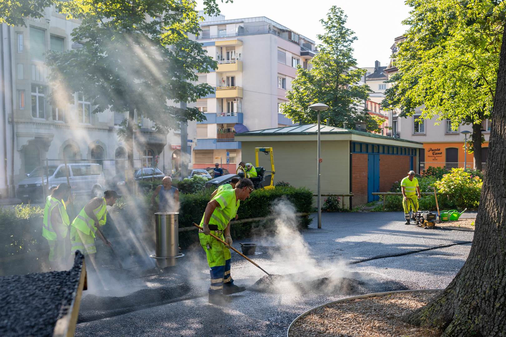 Für die Erneuerung der Grünflächenbeläge liessen wir ein spezielles Kies-Humusgemisch anrühren und verteilten Rundkies darauf. Die Flächen wurden durch die Stadtgärtnerei mit Rasen angesät. Zudem entfernten wir die bestehenden Abfalleimer und ersetzten diese durch acht in den Boden versenkte Unterflurcontainer.