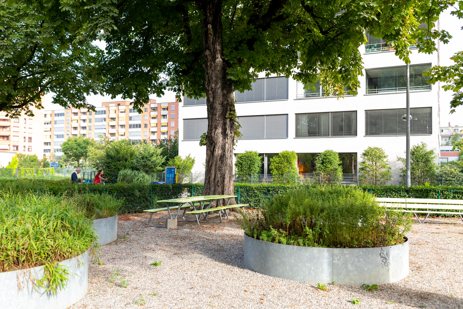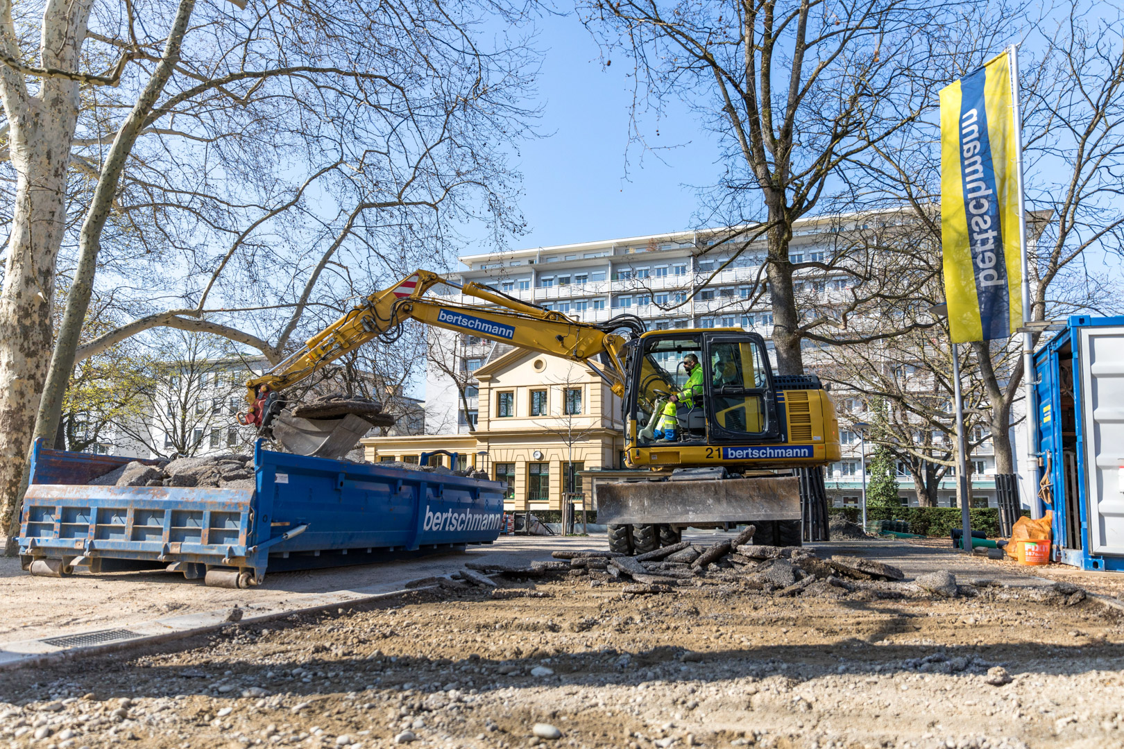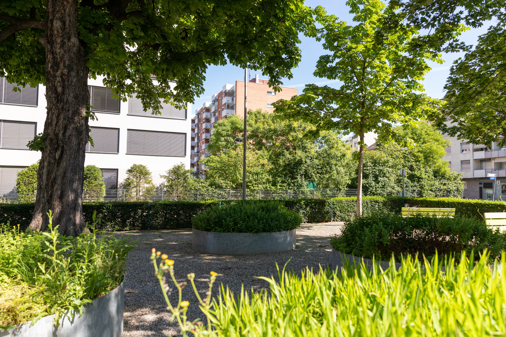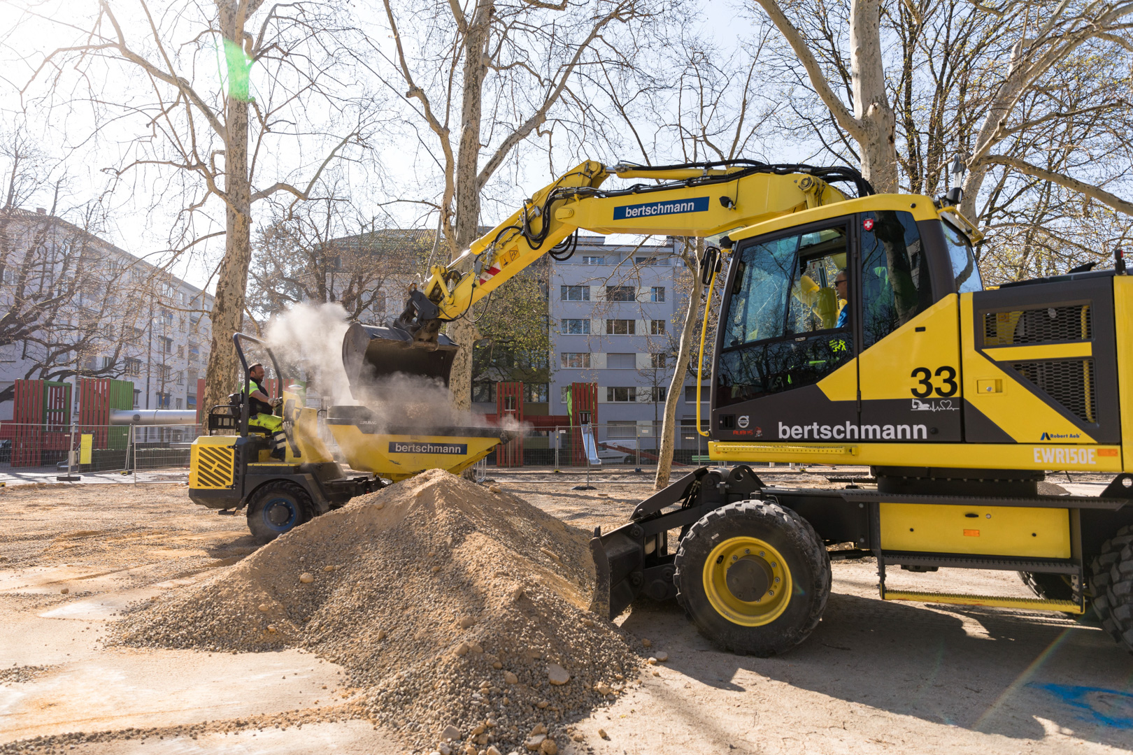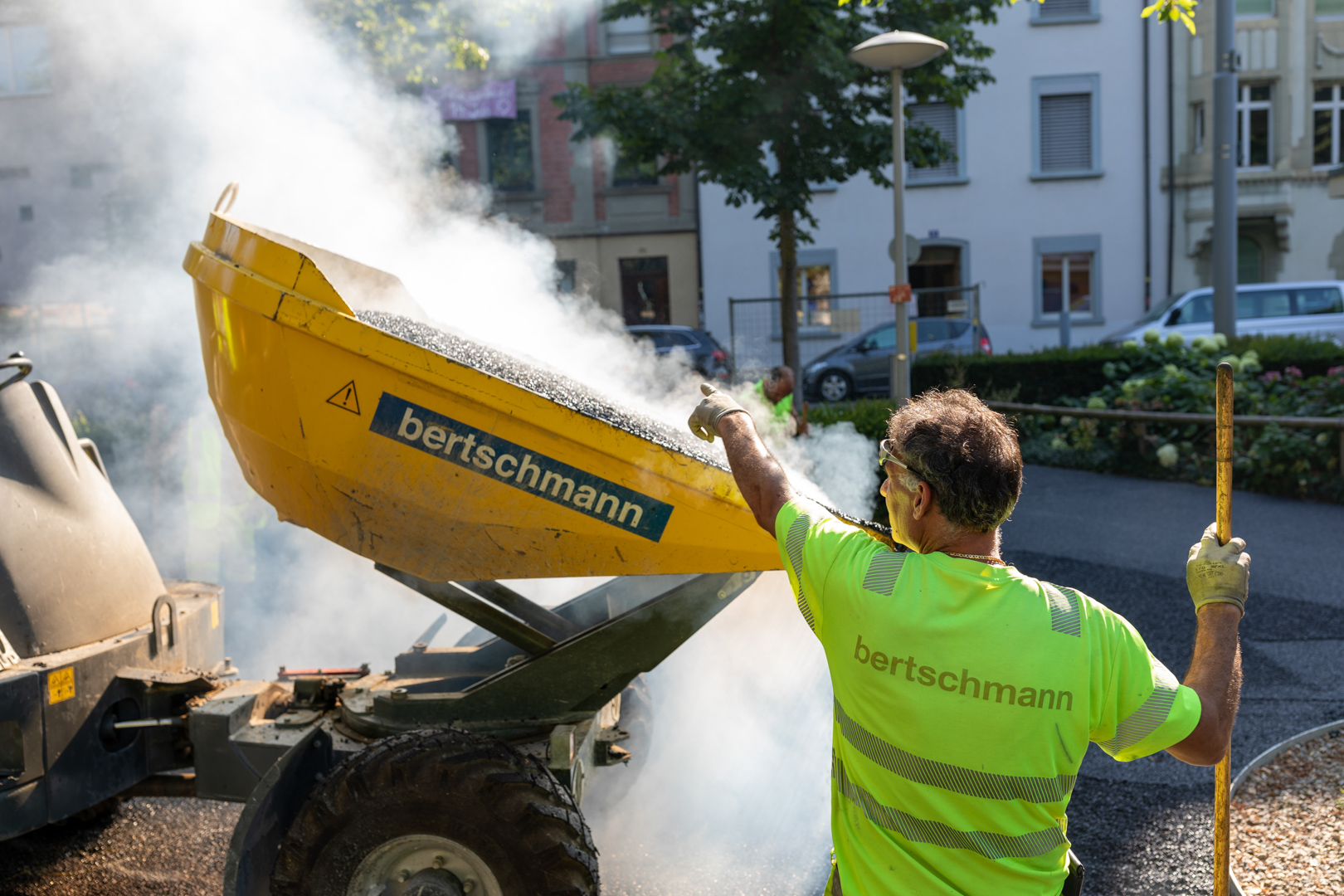 Für die Erneuerung der Grünflächenbeläge liessen wir ein spezielles Kies-Humusgemisch anrühren und verteilten Rundkies darauf. Die Flächen wurden durch die Stadtgärtnerei mit Rasen angesät. Zudem entfernten wir die bestehenden Abfalleimer und ersetzten diese durch acht in den Boden versenkte Unterflurcontainer.