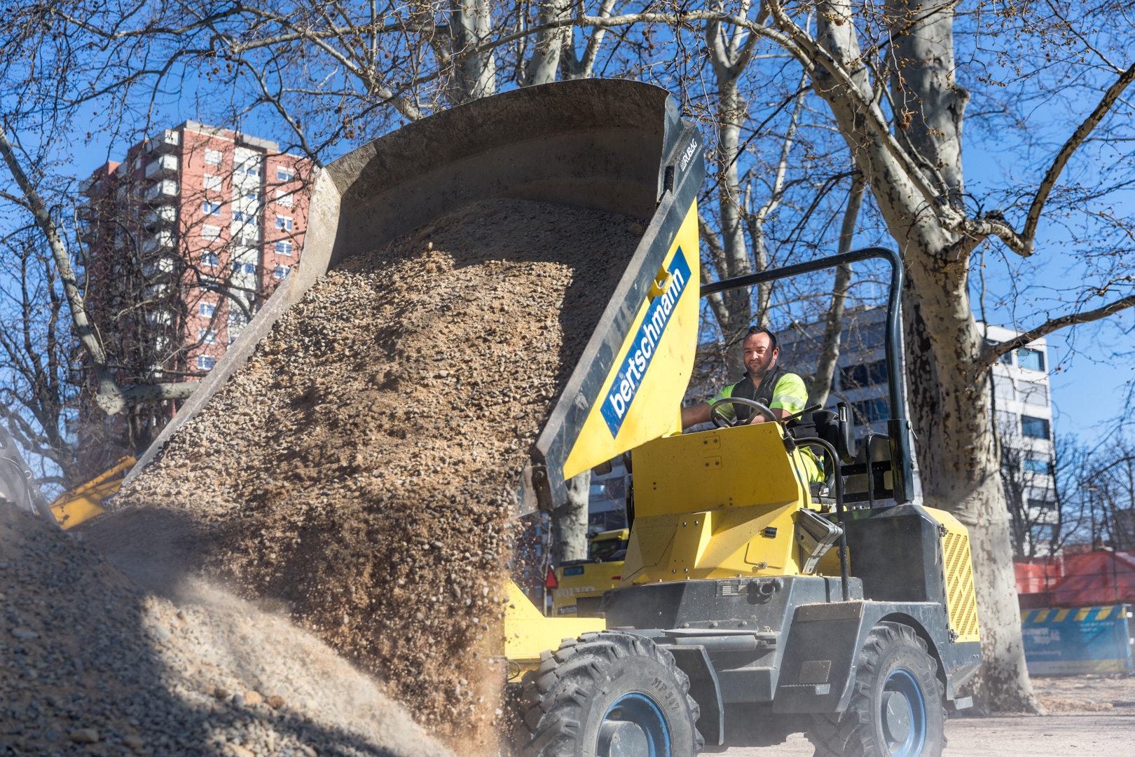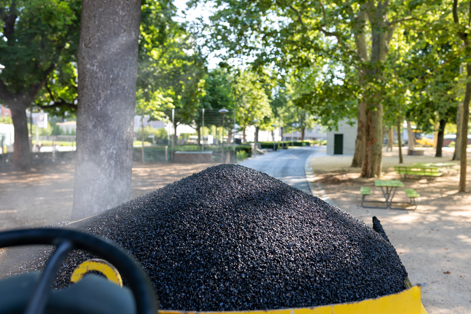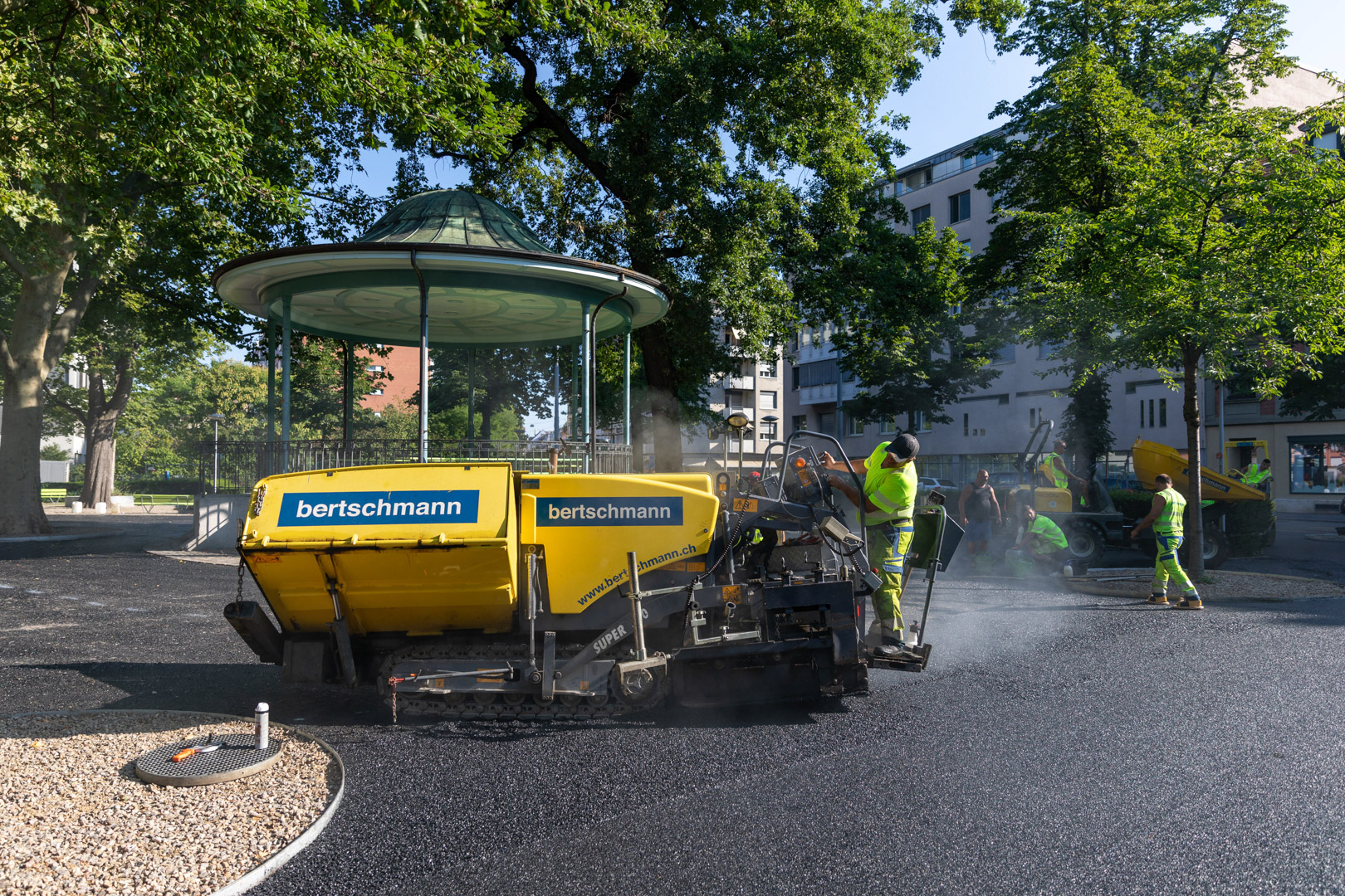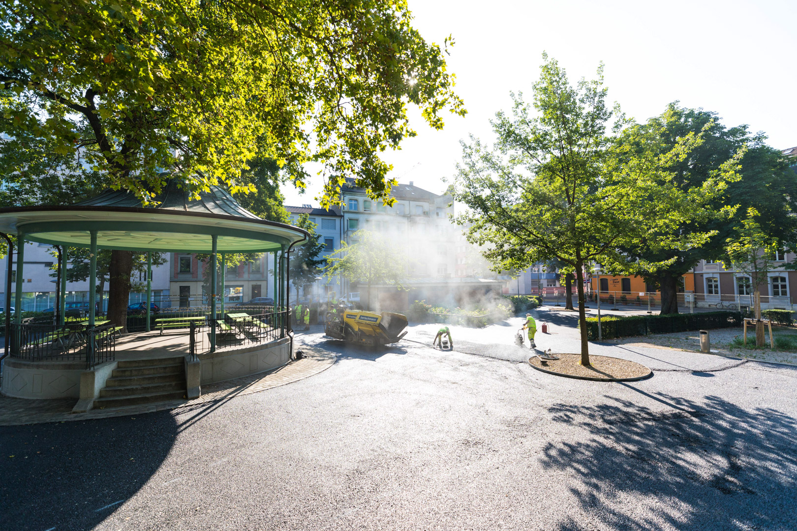 Im Zentrum der Claramatte bauten wir einen speziellen Stabilizer mit dem Belagsfertiger ein. Dieser hochfunktionale Belag wird auf natürlicher Basis hergestellt und weist eine gute Wasserdurchlässigkeit und Staubbindung auf. Die perfekte Lösung für den Park und ideale Unterstützung der neuen Entwässerung.