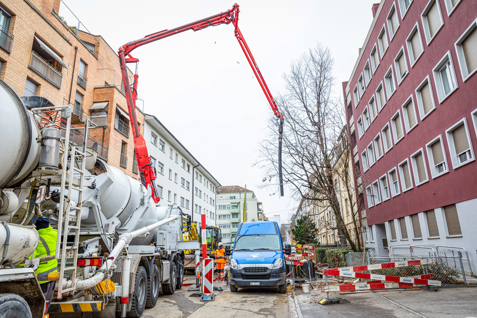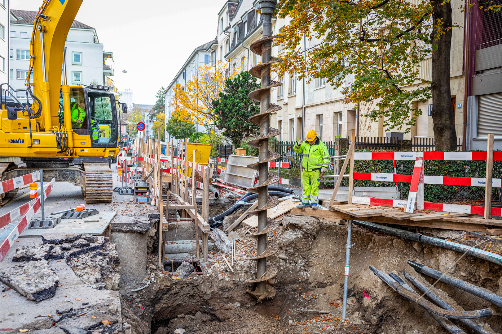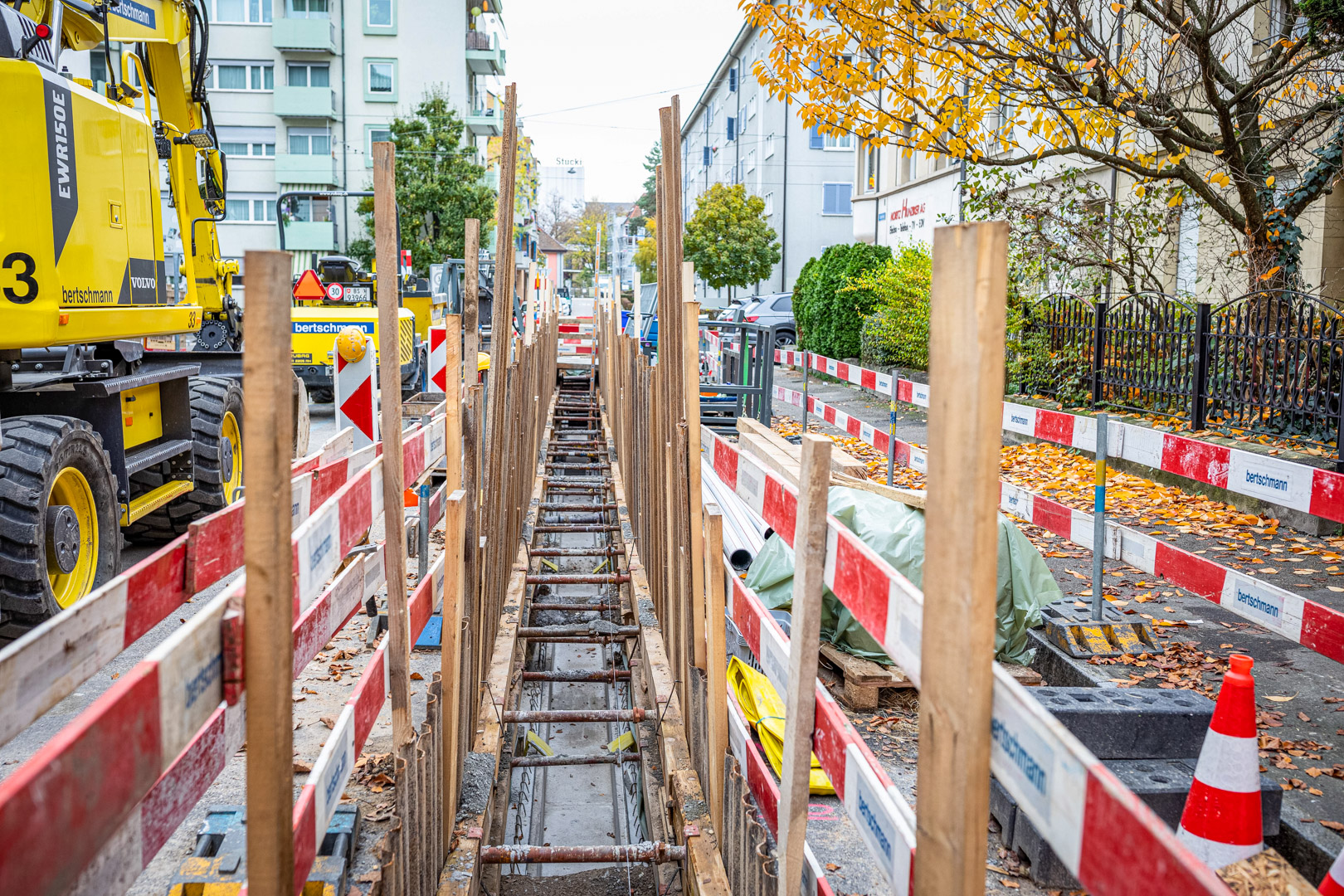 Die Bertschmann AG erstellt insgesamt drei Fernwärme-Kompensatorenschächte. Anschliessend werden durch die IWB die Gasleitungen, die Wasserleitungen sowie die Elektrik verlegt. Die Randabschlüsse inklusive den Strassenbauarbeiten übernimmt wiederum die Bertschmann AG. Nach Bauabschluss werden vier Mehrfamilienhäuser an die Fernwärmeleitung angeschlossen sein.
