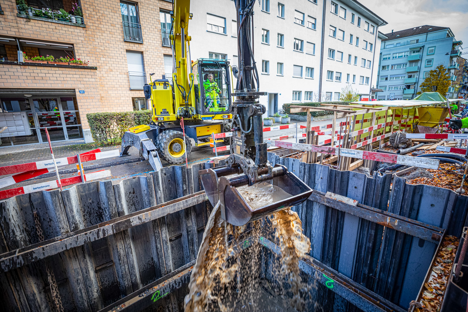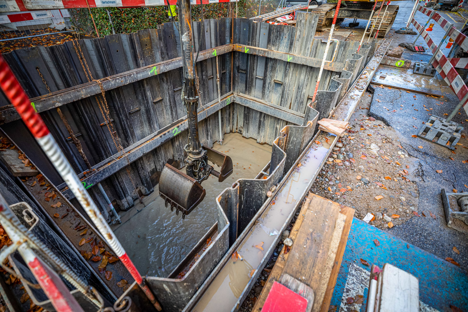 Der Maschinist hatte aufgrund der tiefen Baugrube keine Sicht auf den Greifer und war auf die Anweisungen seiner Kollegen angewiesen. Als zusätzliche Hilfe wurde eine Kamera an der Spundwand installiert, welche ihm eine indirekte Sicht in die Grube verschaffte. Im Vorfeld wurden Auflockerungsbohrungen durchgeführt, da der Boden sehr hart ist. Anschliessend konnten die Spundwände 7m in den Boden eingetrieben werden.