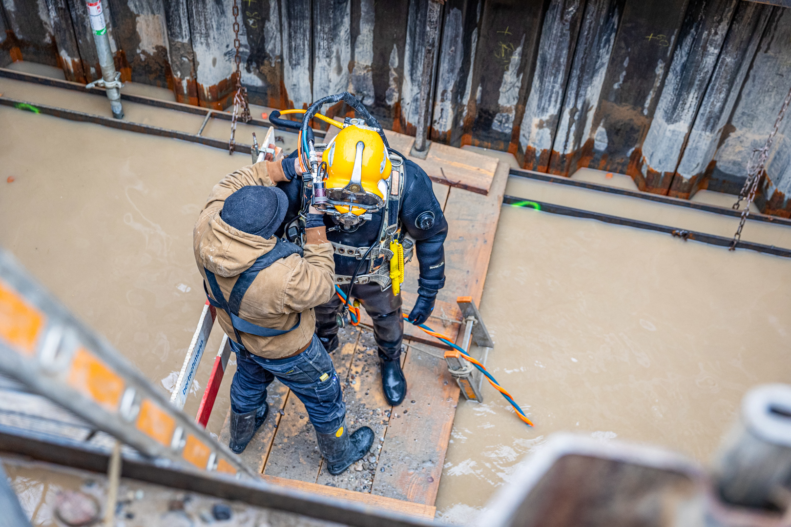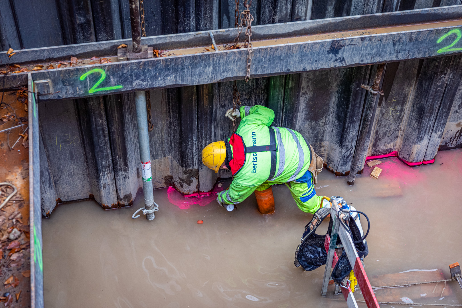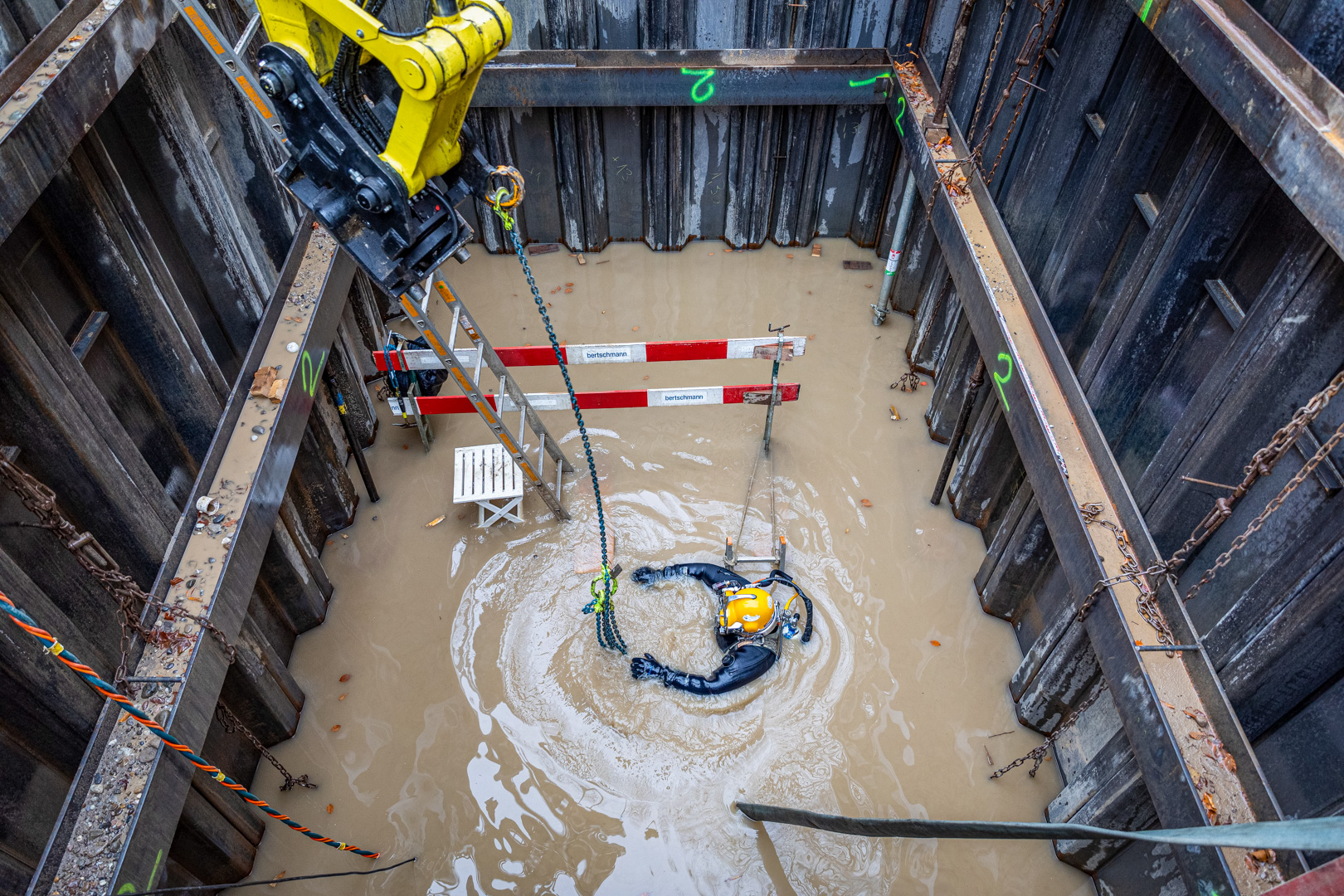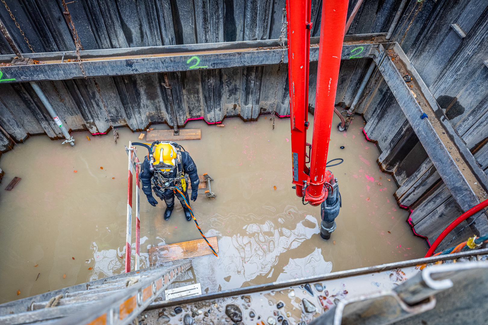 Für die Arbeiten unter Wasser wurden speziell ausgebildete Taucher eingesetzt. Die Taucher hatten bei der Ausführung der Arbeiten aufgrund des trüben Wassers absolut null Sicht. Sie mussten sich durch Abtasten in der Grube zurechtfinden und die Spundwände von stark haftendem Material reinigen. Für die Betonarbeiten stellten die Taucher sicher, dass der Beton unterhalb des Wasserspiegels am richtigen Ort positioniert wurde.
