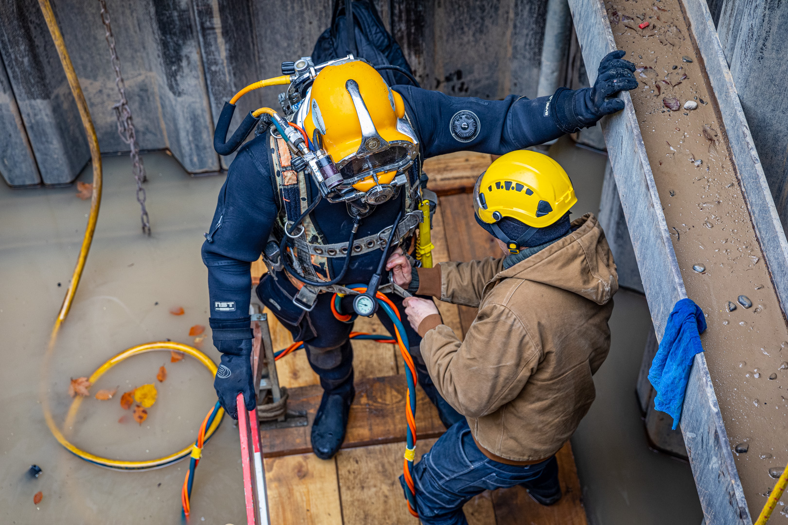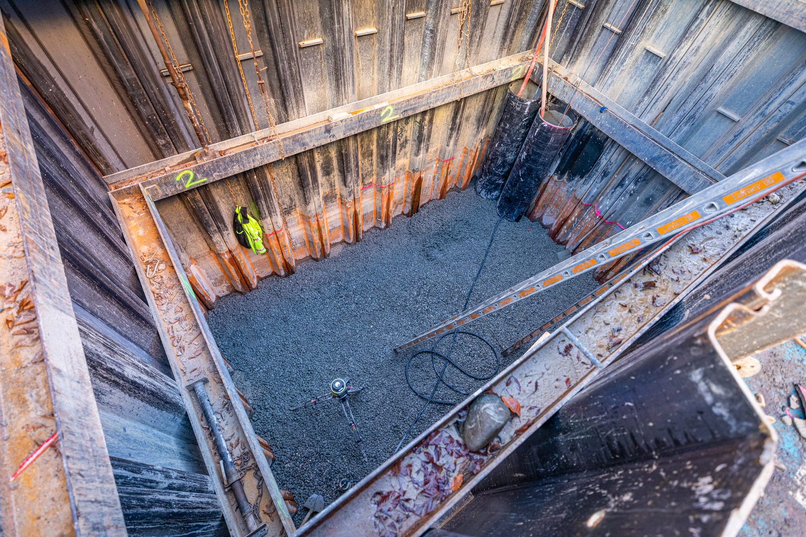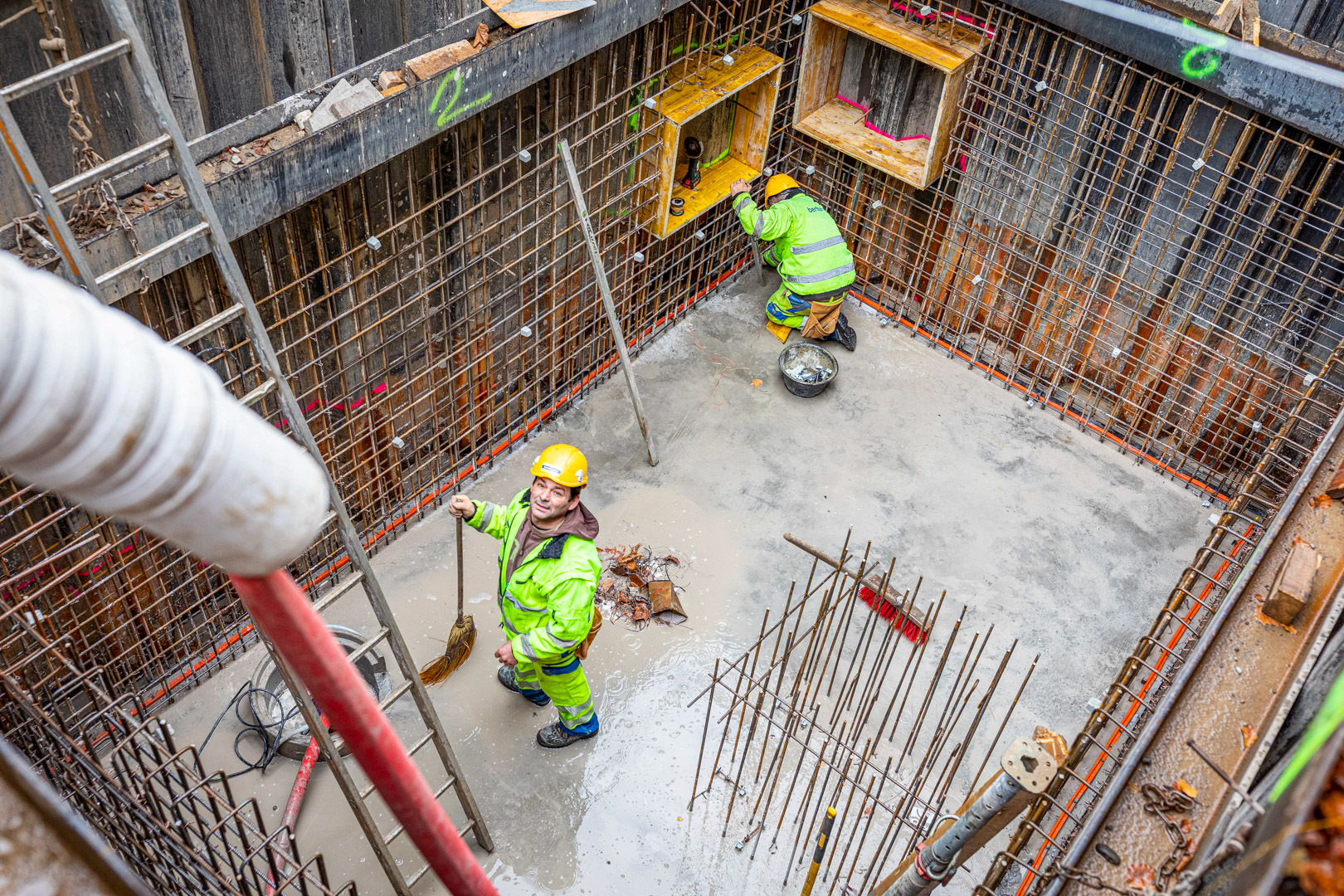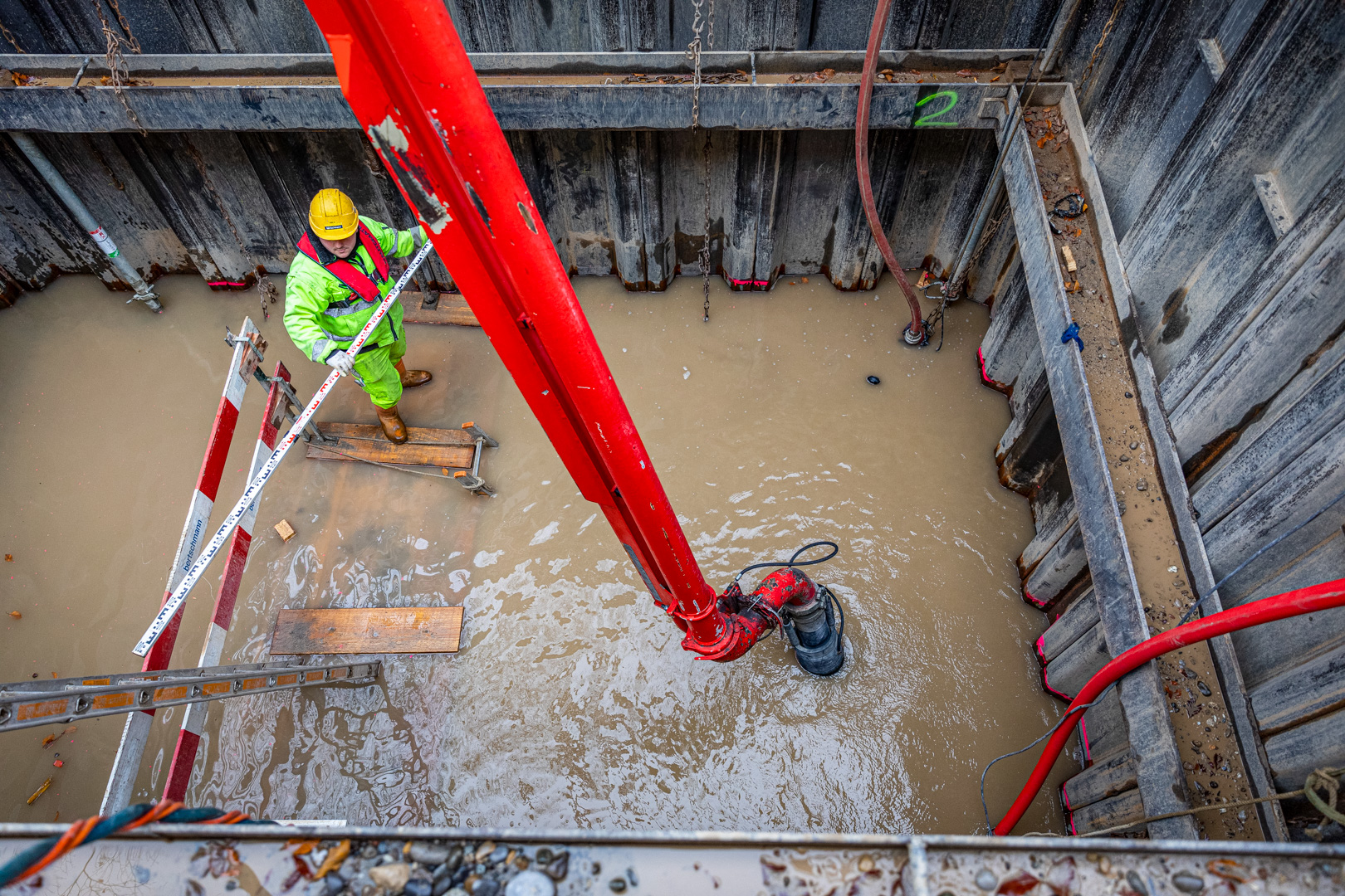 Für die Arbeiten unter Wasser wurden speziell ausgebildete Taucher eingesetzt. Die Taucher hatten bei der Ausführung der Arbeiten aufgrund des trüben Wassers absolut null Sicht. Sie mussten sich durch Abtasten in der Grube zurechtfinden und die Spundwände von stark haftendem Material reinigen. Für die Betonarbeiten stellten die Taucher sicher, dass der Beton unterhalb des Wasserspiegels am richtigen Ort positioniert wurde.