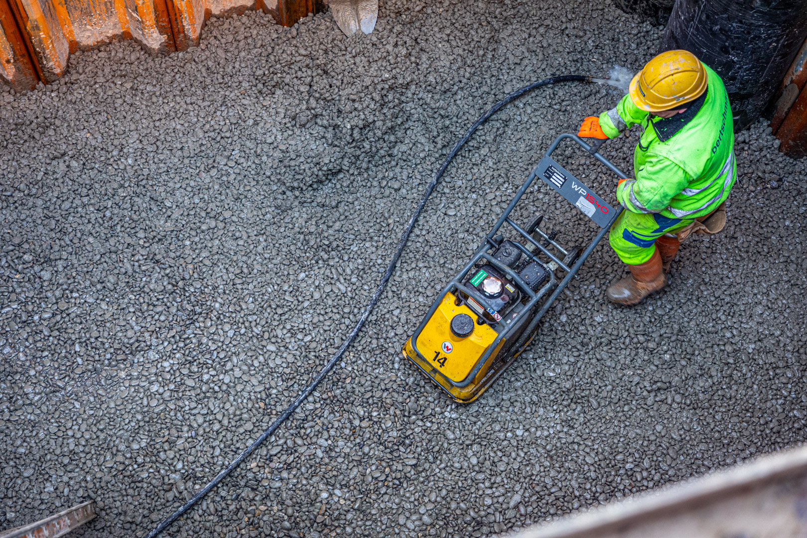 Um einen späteren Auftrieb der Leitungen durch das Grundwassers zu verhindern, füllten die Arbeiter 42 m3 Unterwasserbeton mit einer Betonpumpe ein. Als Trennlage zum Abpumpen des Restwassers folgten 9 m3 Sickerbeton. Schliesslich wurden 40 m3 Konstruktionsbeton für das Schachtbauwerk eingebaut.
