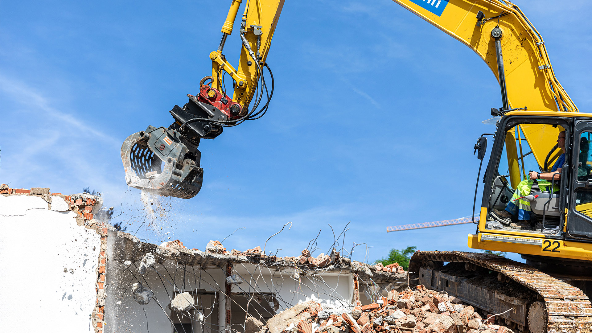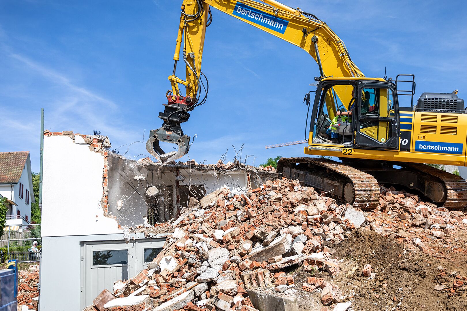 Es staubt und kracht an der Gartenstrasse in Therwil. Röbi, unser Polier vor Ort, thront mit seinem Bagger auf einem Haufen Backensteinschutt und fasst mit dem Greifer nach einem Brocken der Hausmauer. Stück für Stück trägt er so ab und das Häuschen wird immer kleiner. Das Schuttmaterial wird feinsäuberlich sortiert und für die Entsorgung in verschiedene Mulden aufgeteilt.