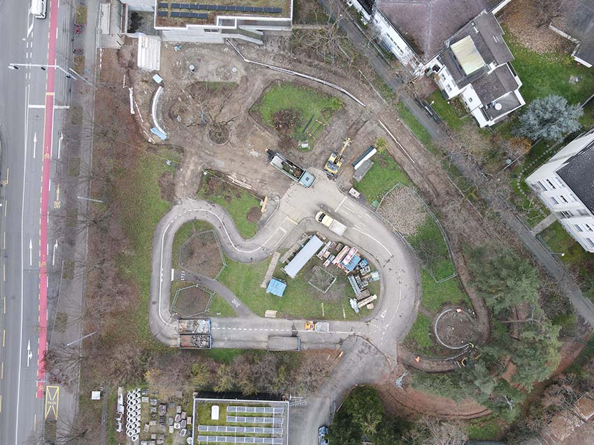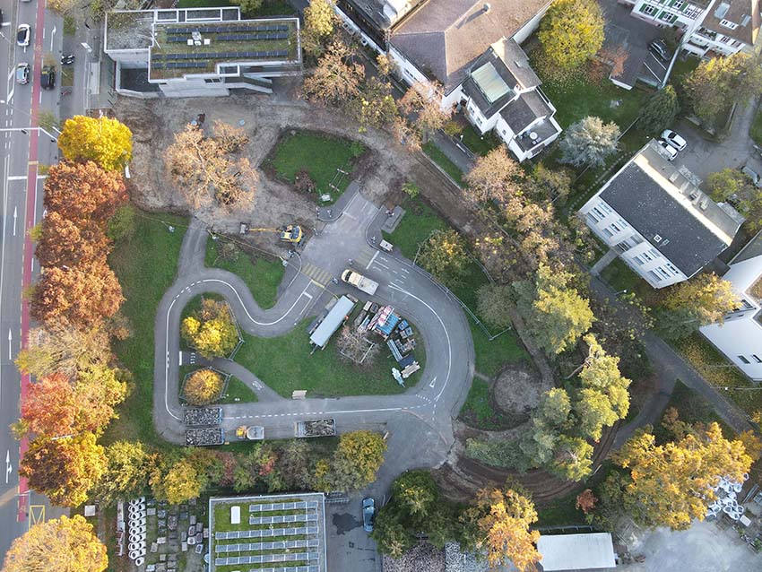 Die Wege und Fahrbahnen werden neu asphaltiert. Signalisation und Markierung werden den aktuellen Verkehrsregeln angepasst und neue Elemente wie eine Trottoirüberfahrt werden ergänzt. Die Zugangswege zu den beiden neuen Aufenthaltsbereichen in den Rasenflächen wie auch die Belagsflächen der kleinen Grünfläche im südlichen Bereich werden mit einer Deckschicht aus gebrochenem Natursteinmaterial abgeschlossen, welcher mehr Wasser speichern kann und somit für mehr Biodiversität sorgt.