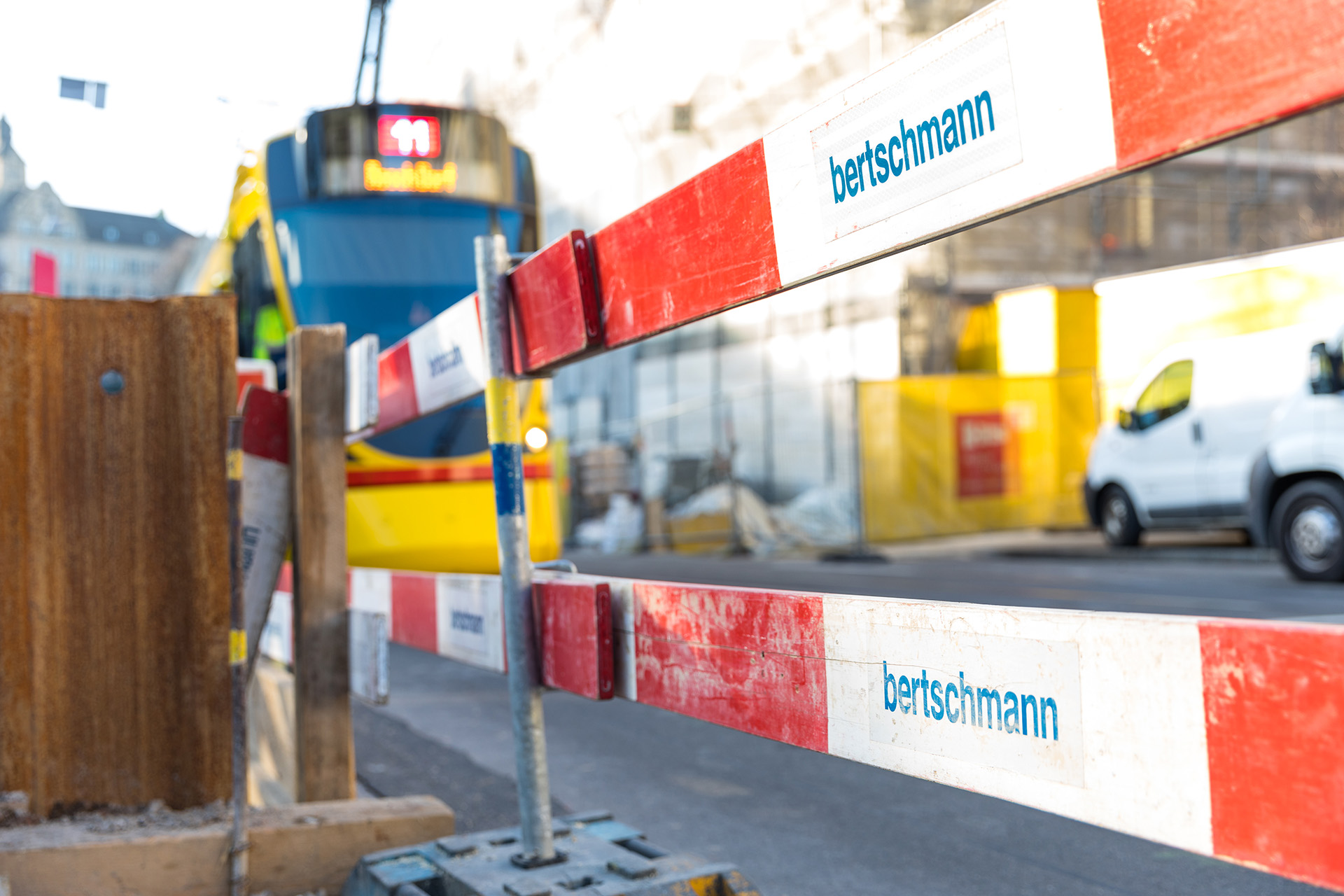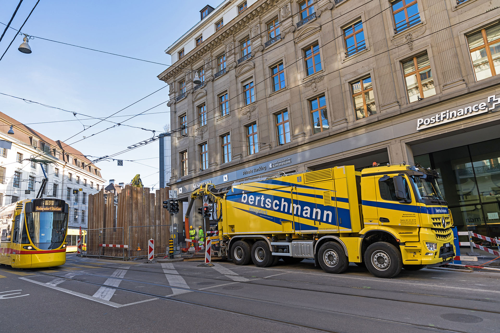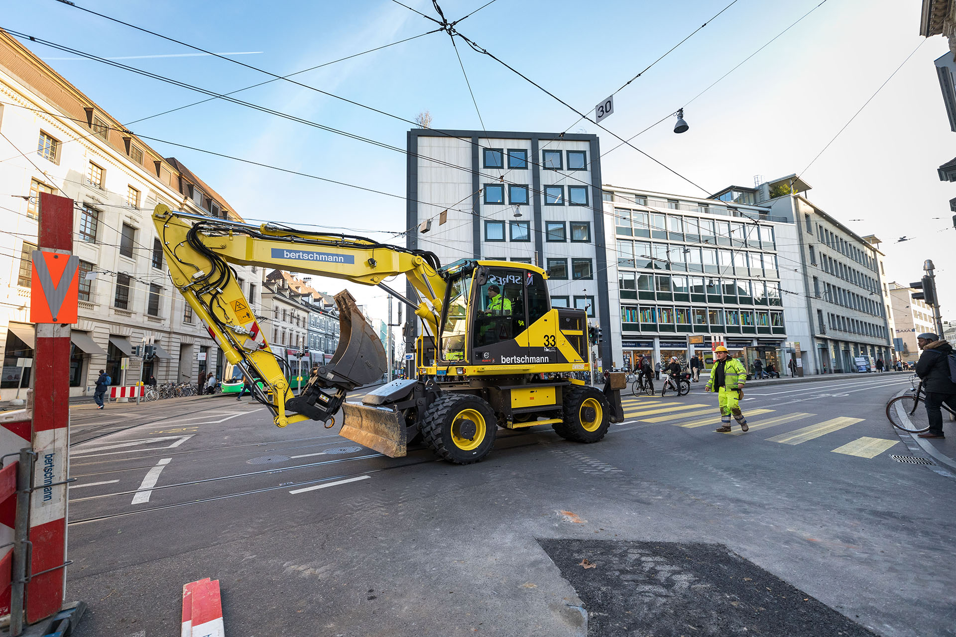 Seit Januar arbeitet Bertschmann entlang des Steinenbergs und die Aeschenvorstadt hoch bis zum Bankverein an den Grabarbeiten für die neuen Fernwärmeleitungen der UBS. Die Arbeiten werden bis im Herbst andauern.