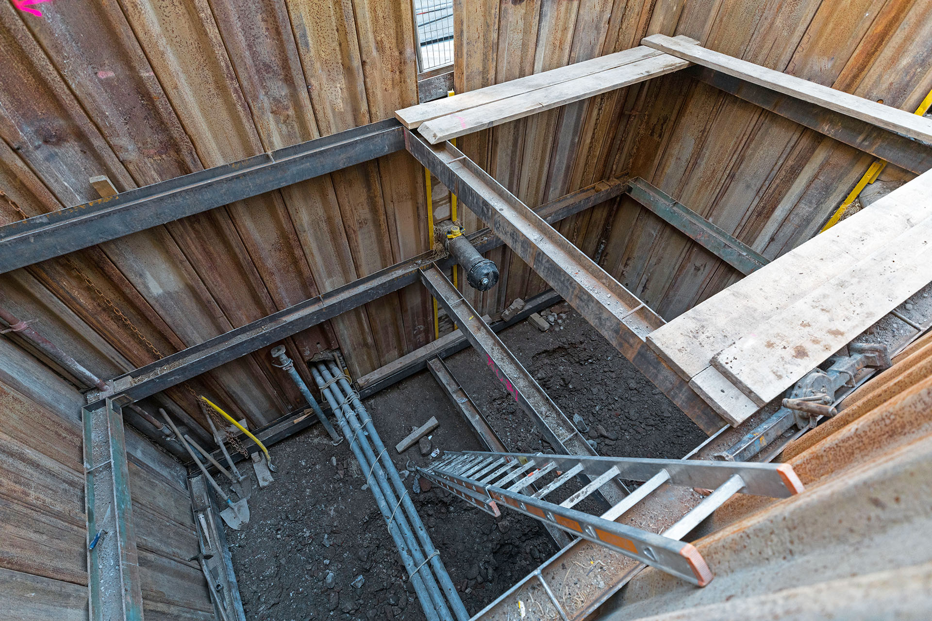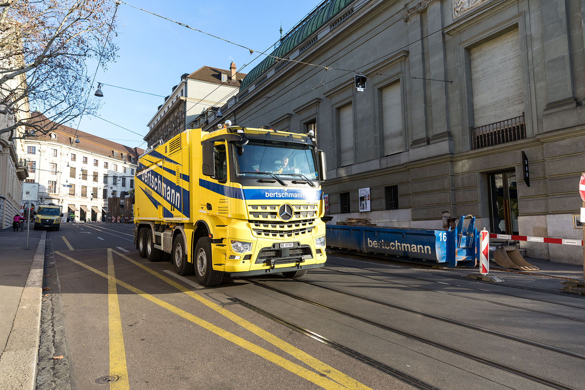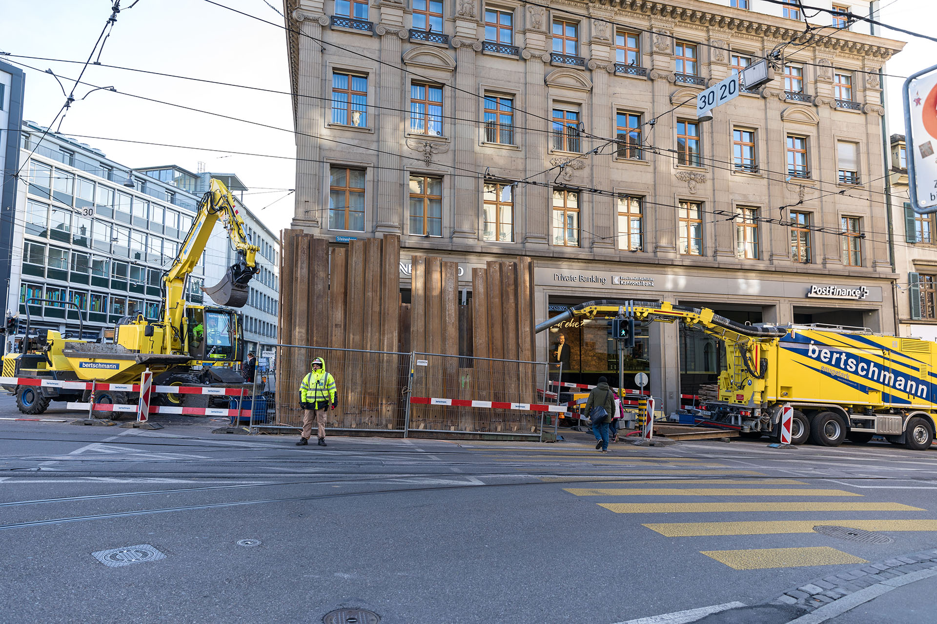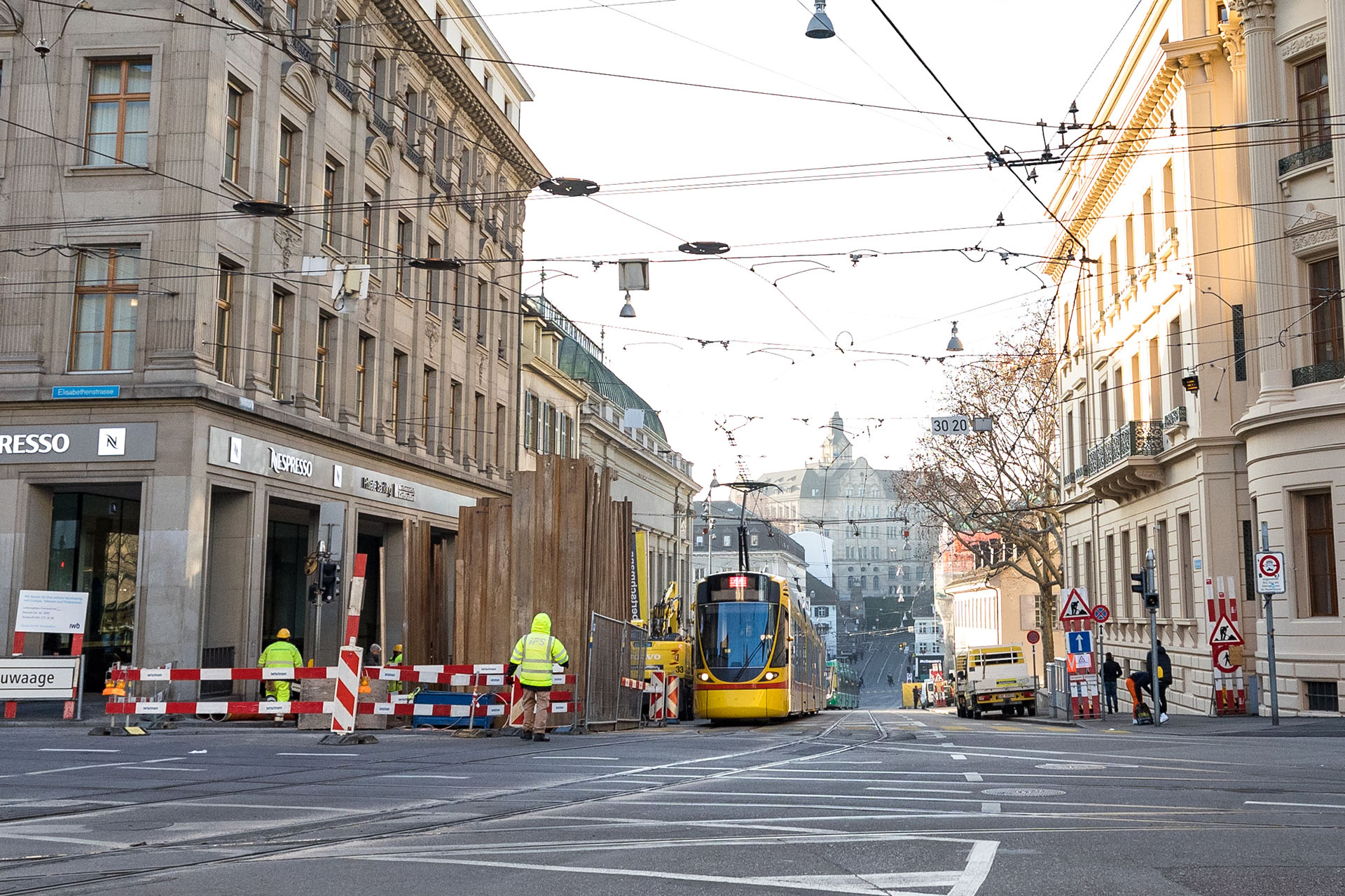 Seit Januar arbeitet Bertschmann entlang des Steinenbergs und die Aeschenvorstadt hoch bis zum Bankverein an den Grabarbeiten für die neuen Fernwärmeleitungen der UBS. Die Arbeiten werden bis im Herbst andauern.