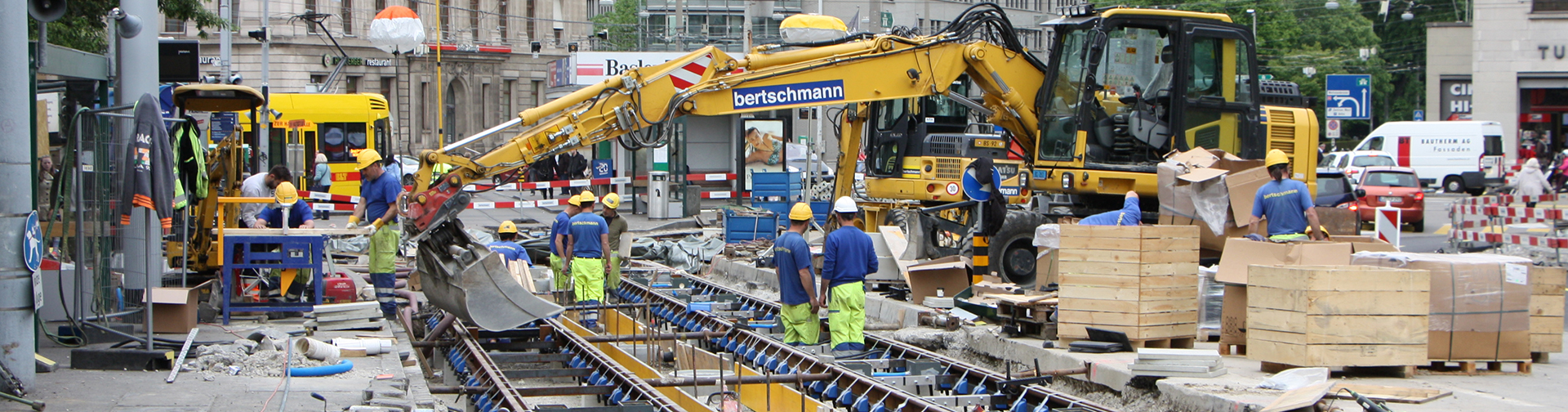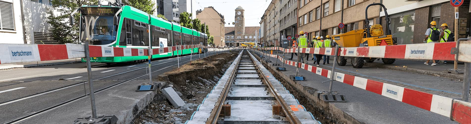 Alles nach Fahrplan: Bertschmann bringt das Tram in Fahrt – aber nicht nur. Als langjähriger Partner der Basler Verkehrsbetriebe haben wir den Gleisbau im Meterspurbereich voll im Griff. Als Spezialist für feste Fahrbahnen sorgen wir im Mehrschichtbetrieb rund um die Uhr dafür, dass es zu möglichst kurzen Stillzeiten kommt. Genauso kompetent erstellen unsere geschulten Fachleute Gleise und alles was dazu gehört für die SBB und für die Industrie. Ausserdem ist unsere Bauunternehmung Ihr Partner für Kranbahnen.